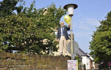 TBL-Vorstand Wolfgang Herwig demonstriert, wie weit das Wasser steigen würde, wenn der Rhein bei einem Extremhochwasser alle Deiche und Schutzwände überwinden sollte. Die blaue Markierung stellt den möglichen Wasserstand dar. Bis zu 11,80 Meter Pegelstand ist Leverkusen gut geschützt