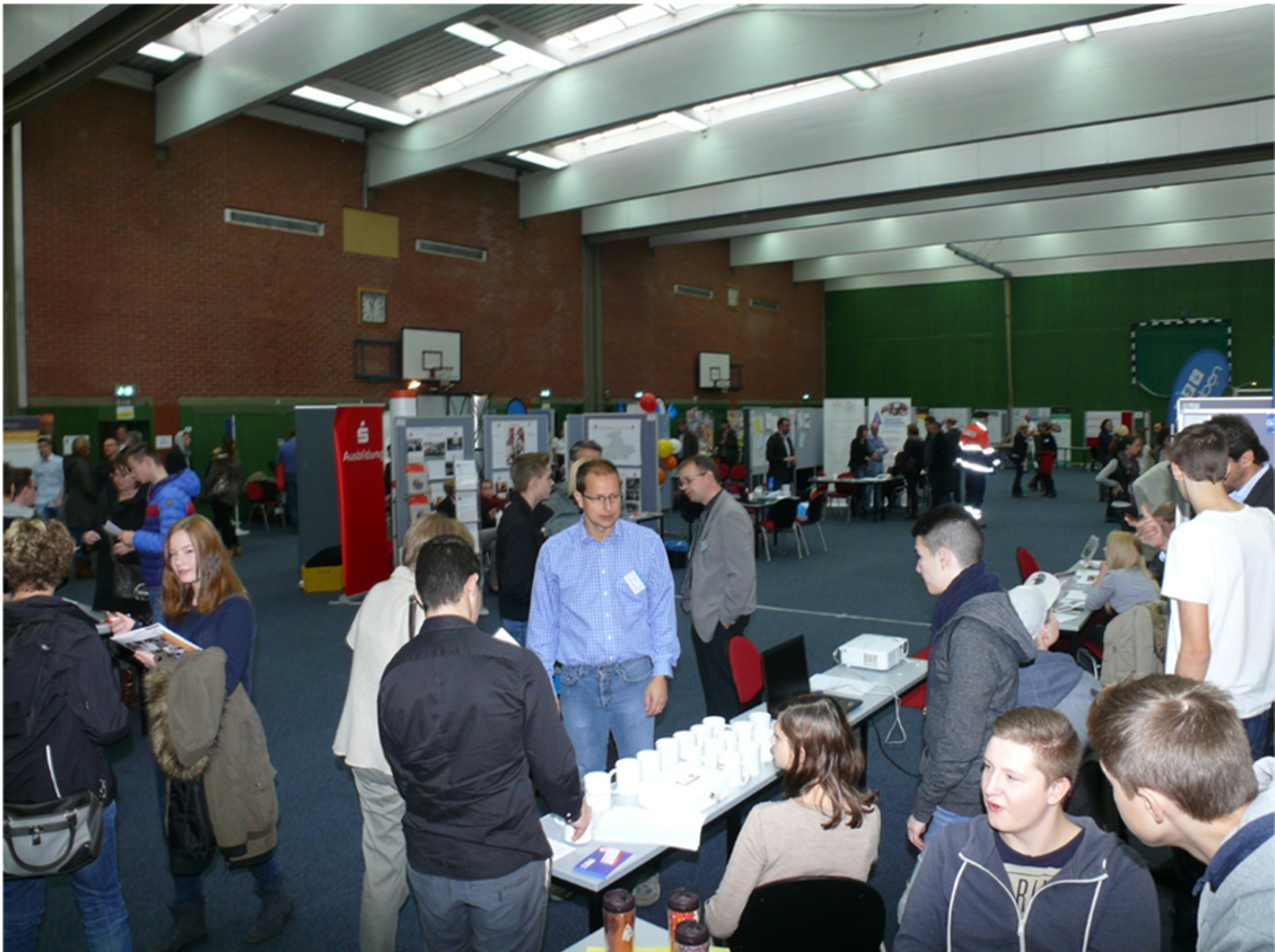 Besucher informieren sich auf der Ausbildungsbörse in der Sporthalle des Rhein-Maas Berufskollegs über die verschiedenen Arbeitgeber. Foto: Rhein-Maas Berufskolleg / Abdruck honorarfrei