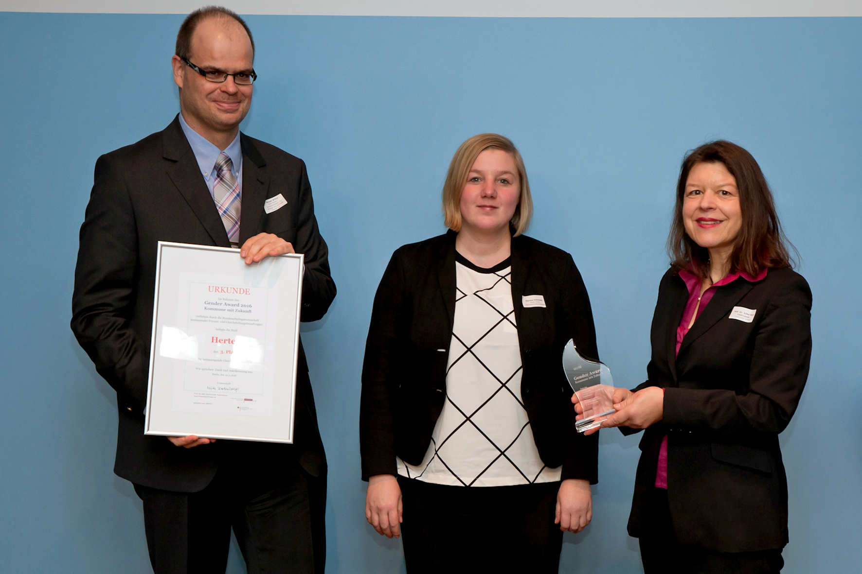 Die Gleichstellungsbeauftragte Maresa Kallmeier (Mitte) und Michael Wilke, Leiter des Fachbereichs Zentrale Steuerung, nahmen den Gender Award von Jurymitglied Prof. Dr. Silke Ruth Laskowski entgegen.