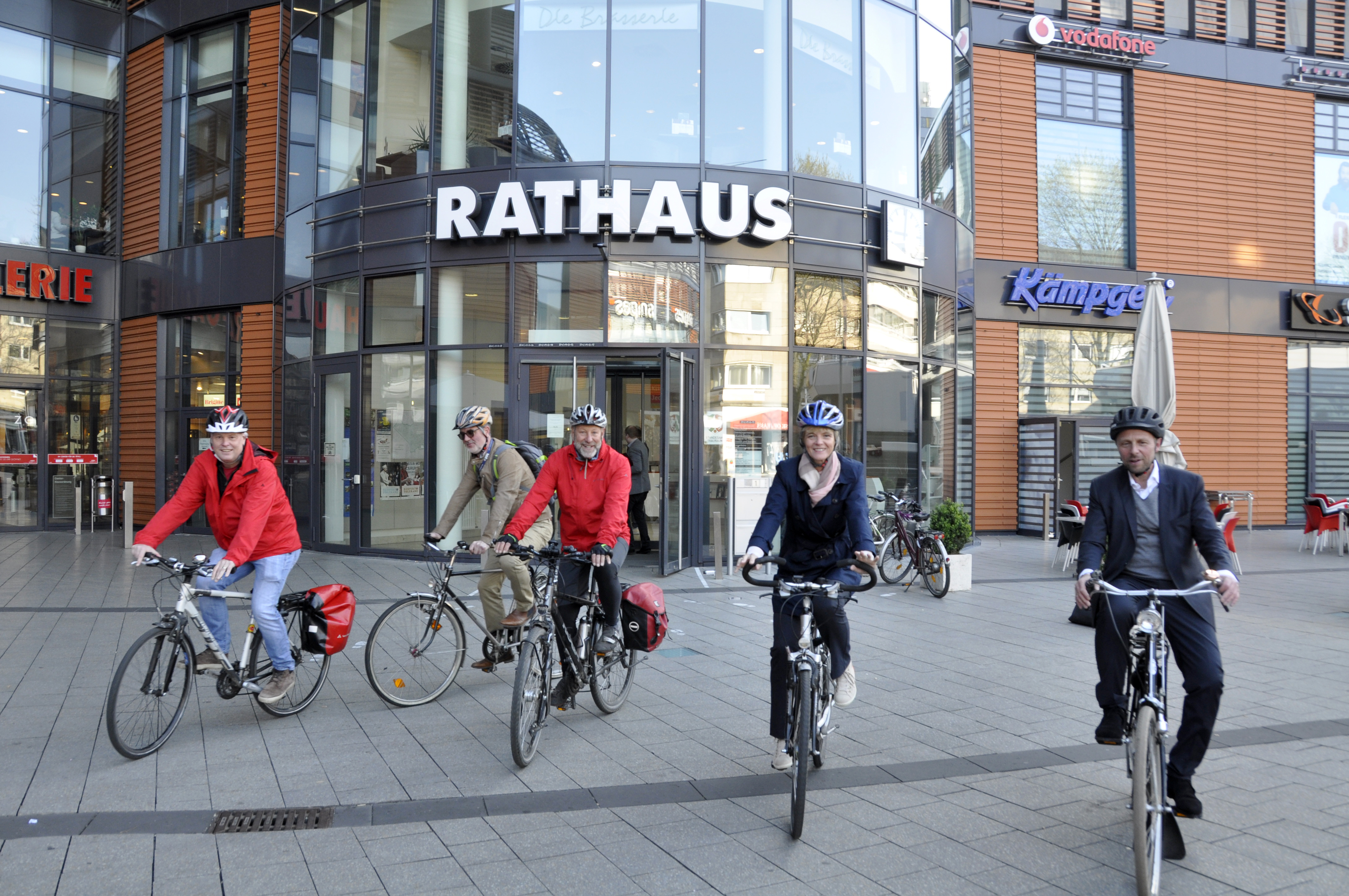 Für das STADTRADELN aufgesattelt: Stadtradel-Star Michael Varutti, Christian Syring, Fachbereichsleiter Tiefbau, Uwe Witte, ADFC, Baudezernentin Andrea Deppe und Oberbürgermeister Uwe Richrath (v.l.)