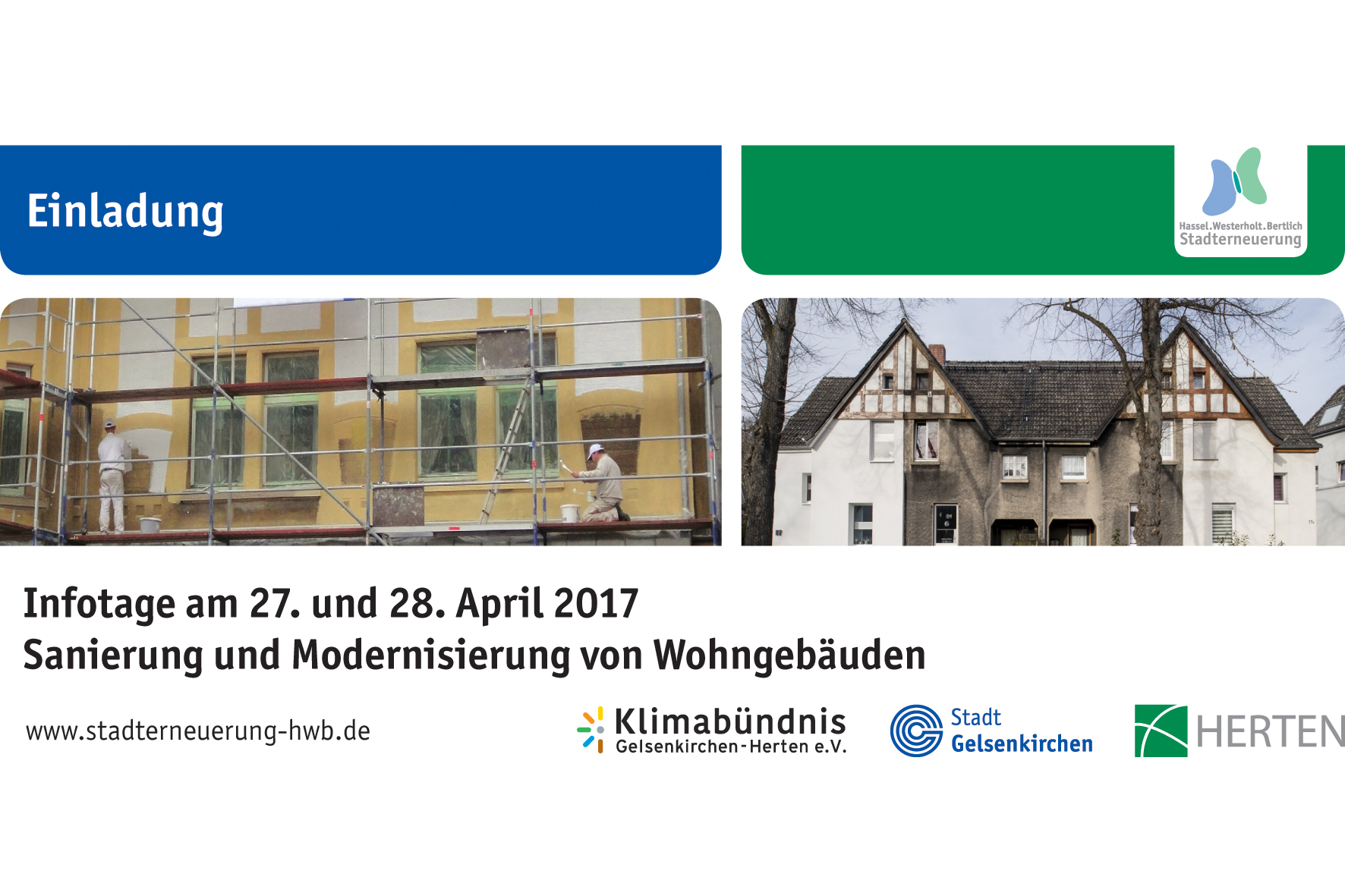 Private Immobilienbesitzerinnen und -besitzer in Hassel, Buer-Nord, Westerholt und Bertlich sind herzlich zu den Infotagen am Donnerstag, 27. April 2017, von 18 bis 20 Uhr und am Freitag, 28. April 2017, von 10 bis 16 Uhr eingeladen.