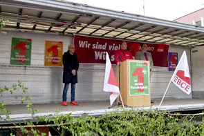 Bürgermeister Fred Toplak, Thomas Prinz, Sprecher der Hertener IG BCE und Vorstandsmitglied im DGB-Ortsverband Herten und Claus-Harald Güster, stellvertretender Vorsitzender der Gewerkschaft Nahrung-Genuss-Gaststätten, positionierten sich bei der Maikundgebung deutlich gegen rechte Strömungen in Deutschland.