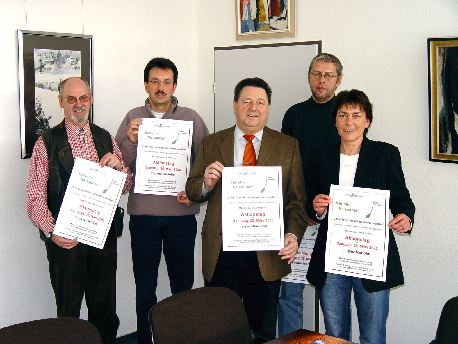 Stellten die Aktion "Iserlohn - Na sauber! 2006" im Iserlohner Rathaus vor (v.l.n.r.): Jürgen Fiedler und Dirk Lachmuth von der Abteilung Natur und Umwelt, Bürgermeister Klaus Müller, Thomas Sprenger von der Stadtwerbung und Christine Schulte-Hofmann, Bereich Medien- und Öffentlichkeitsarbeit.