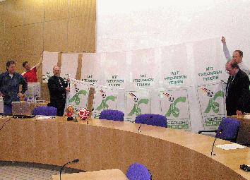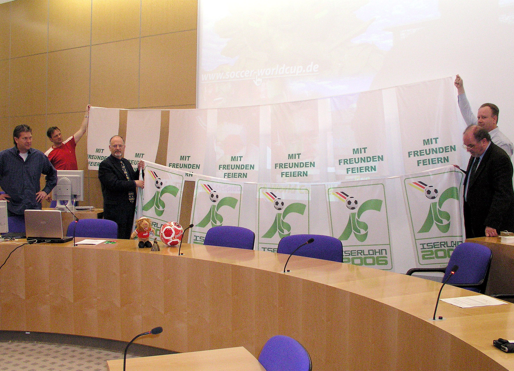 Stellten im Iserlohner Rathaus die Veranstaltungen und Innenstadt-Dekoration zur Fußball-WM vor (v.l.n.r.): Sportbüroleiter Ralf Horstmann, WM-Beauftragter Michael Jüdt, Ressortleiter Soziales, Jugend, Schule, Sport Friedhelm Kowalski und Herbert Wolf und Matthias Mester vom City-Management Iserlohn
