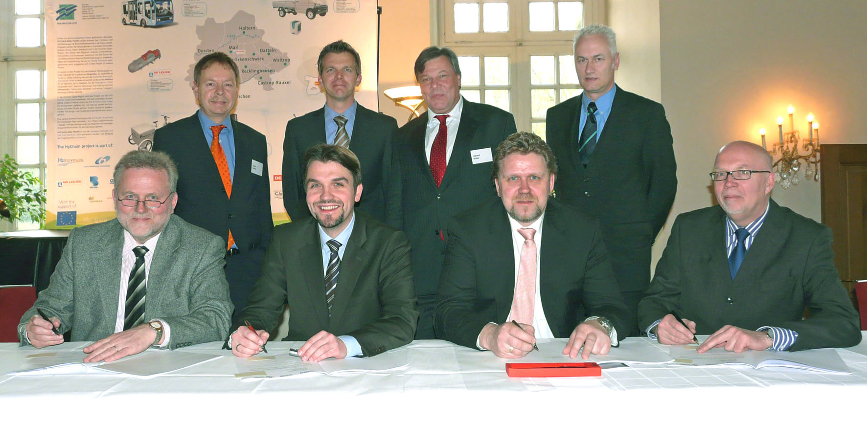 Vertragsunterzeichnung im Rahmen des Projekts HYCHAIN MINI-TRANS: v.l. Gisbert Büttner (Geschäftsführer Hertener Stadtwerke), Stadtbaurat Volker Lindner, Bürgermeister Dr. Uli Paetzel, Dr. Andreas Ziolek (Leiter des Kompetenz-Netzwerkes Brennstoffzelle und Wasserstoff NRW), Willfried Müller (Projektleiter Masterflex AG), Peter Pabst (Inhaber Securplan), Bernd Groß (Geschäftsführer WiN Emscher-Lippe) und Peter Kremer (Technischer Betriebsleiter Zentraler Betriebshof Herten).