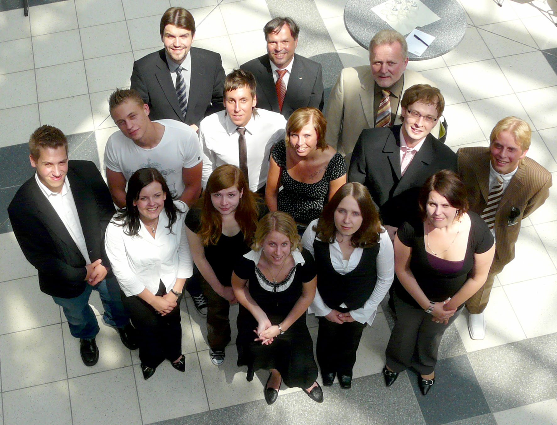 Nun heißt es für Thomas Behnk, Vanessa Drosten, Stefanie Fraßa, Judith Kitscha, Nicola Köster, Sarah Makus, Benjamin Neumann, Patrick Ossa, Christopher Pecher, Pascal Prüter, Jennifer Spichal, Fabian Wessel und Rene Wernicke volle Verantwortung übernehmen. Im Hintergrund (v.l.): Bürgermeister Dr. Uli Paetzel, Prozos Geschäftsführer Horst Stoffner und Gisbert Büttner, Geschäftsführer der Hertener Stadtwerke.