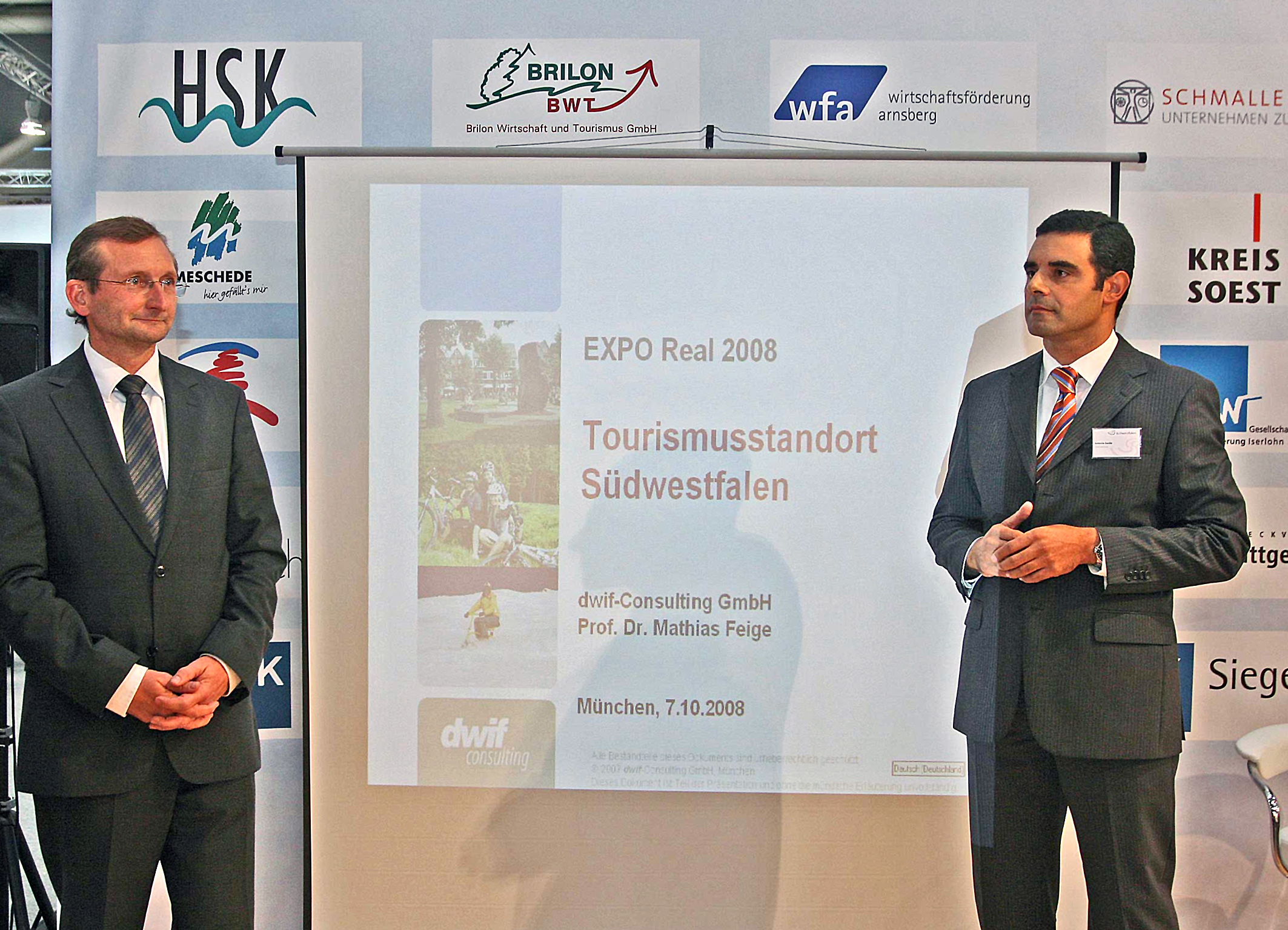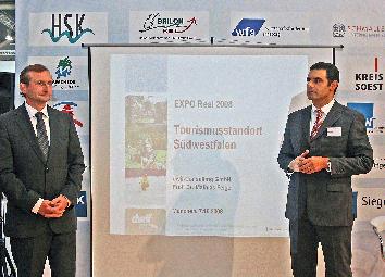Prof. Dr. Mathias Fliege (dwif-Consulting Berlin) und Antonio Guida (Team Hotel Consult GmbH Erwitte) sehen den Tourismus in Südwestfalen gut aufgestellt (v. l.). Foto: Hendrik Klein/Märkischer Kreis
