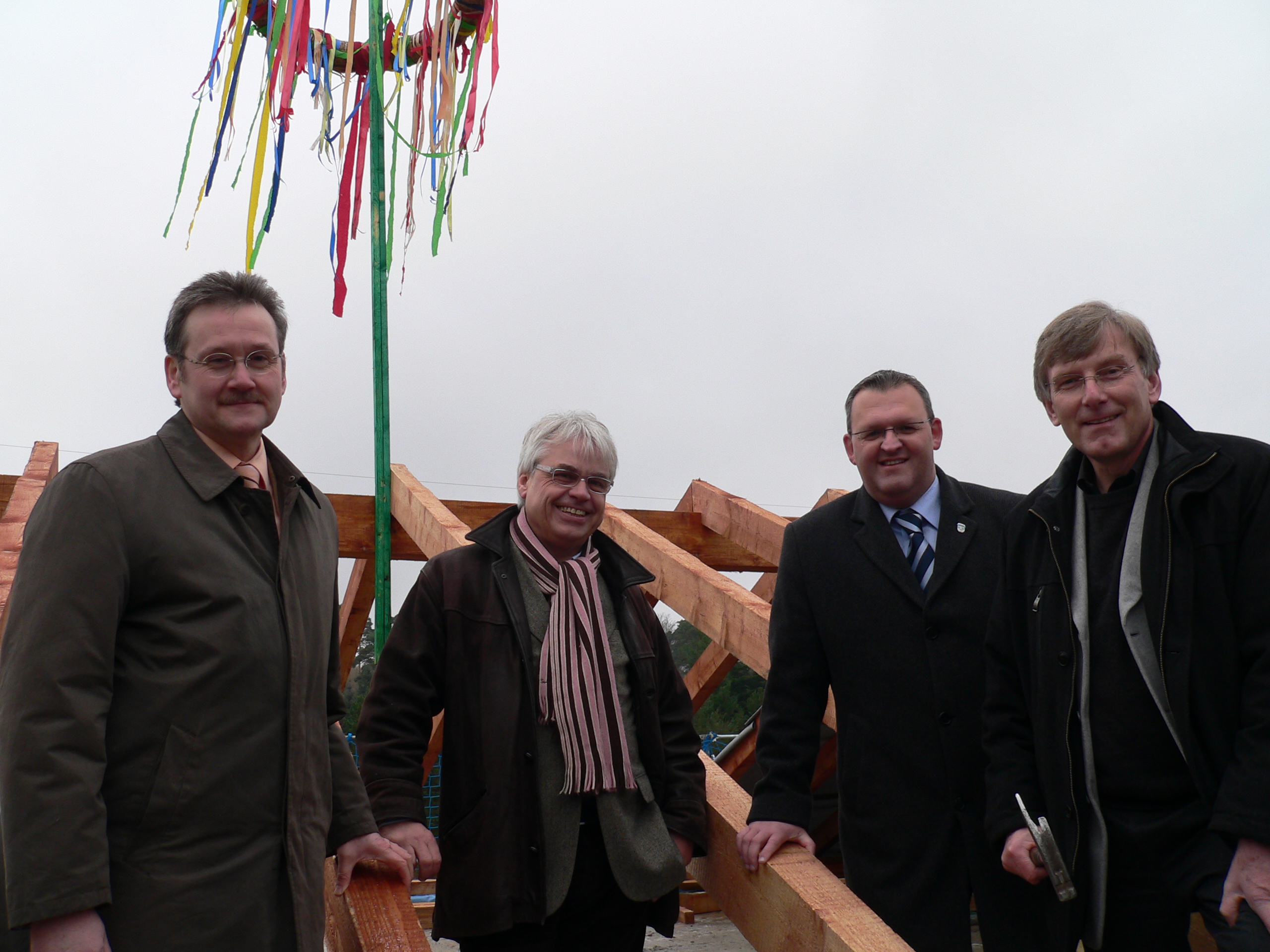 Auf dem Foto freuen sich von links nach rechts Vizelandrat Uwe Schmidt, Architekt Hans-Georg Ohlmeier, Bürgermeister Stefan Hable und Prof. Heinrich Schnatmann (Geschäftsführer des Internationalen Bildungs- und Sozialwerks).