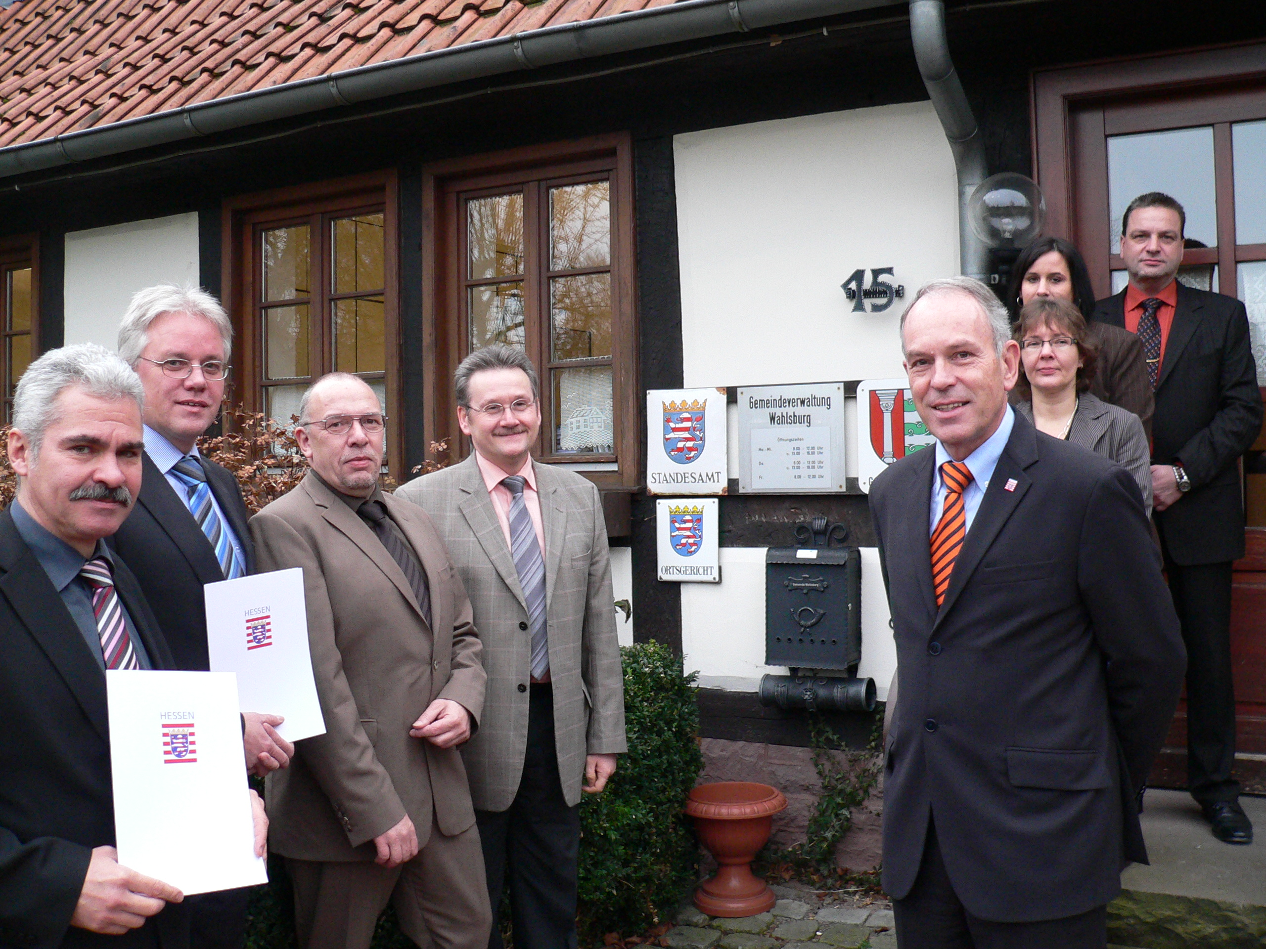 Auf dem Foto sind von links nach rechts Bürgermeister Rüdiger Henne, Bürgermeister Jörg-Otto Quentin, Ronald Brandenstein (Standesamtsaufsicht Landkreis Kassel), Vizelandrat Uwe Schmidt, Regierungspräsident Lutz Klein, Doris Ellermeyer (Standesamt Oberweser), Bianca Volle (Standesamt Wahlsburg) und Holger Förster (Standesamt Wahlsburg) zu sehen.