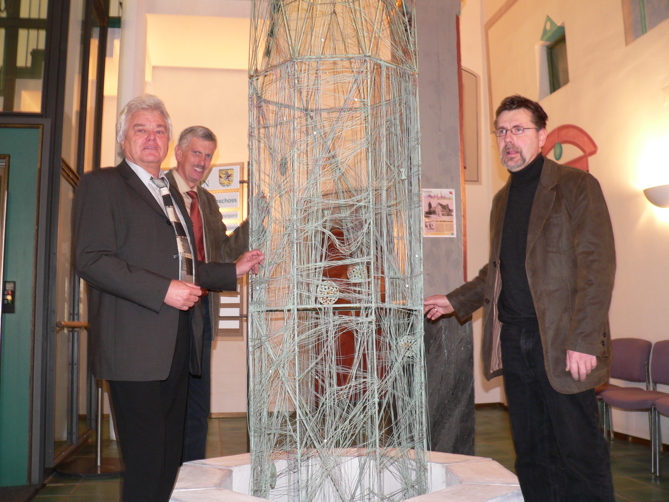 Auf dem Foto halten sich Landrat Dr. Udo Schlitzberger, Bürgermeister Armin Kölling und Künstler Ingo Küpper am Modell fest.