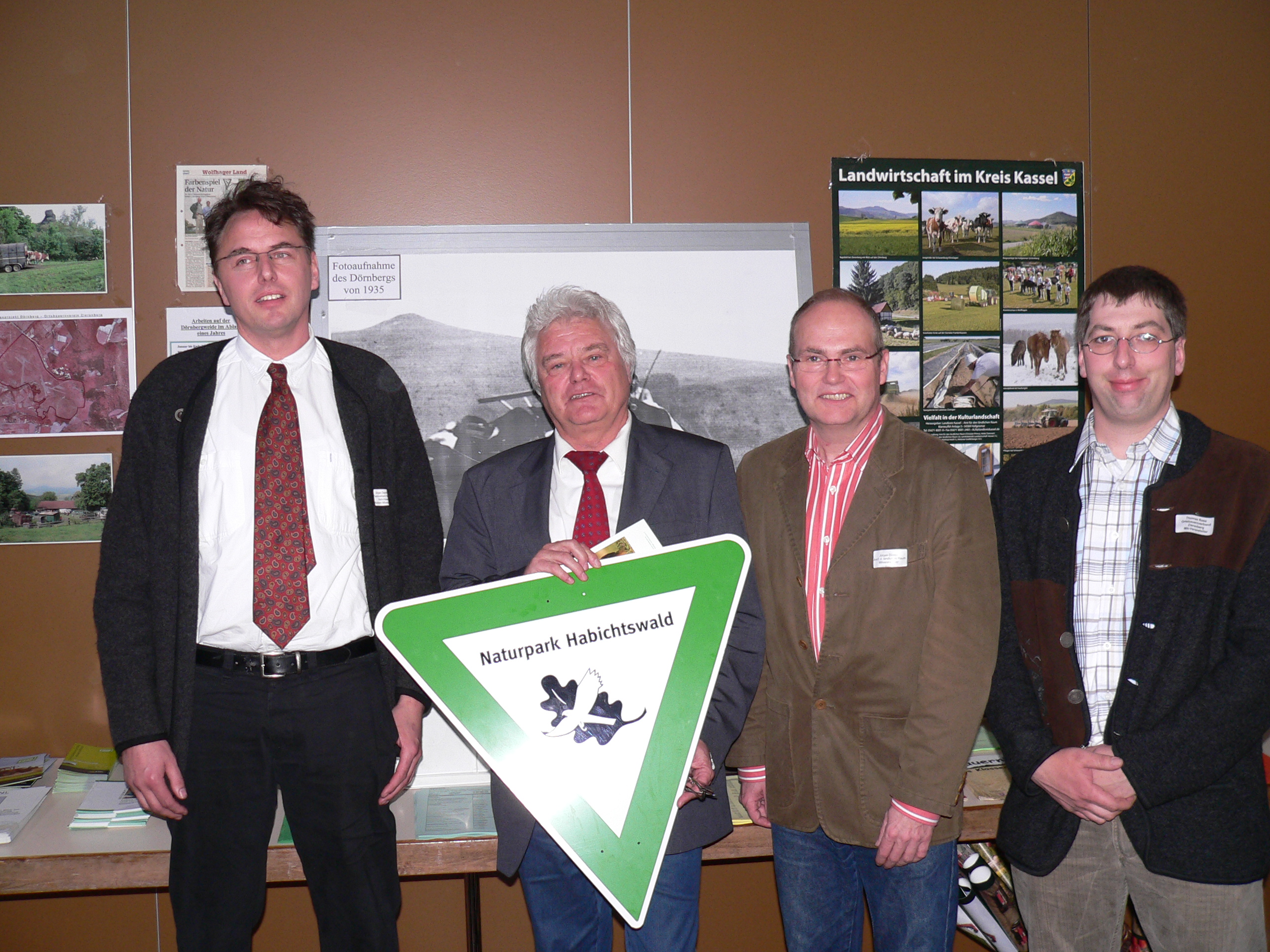 Auf dem Foto sieht man von links nach rechts Jürgen Depenbrock (Geschäftsführer Zweckverband Naturpark Habichtswald), Landrat Dr. Udo Schlitzberger, Jürgen Düster (Amt für den ländlichen Raum Hofgeismar) und der Vorsitzende des Ortsbauernvereins Zierenberg Thomas Rose. Die beiden letztgenannten kümmern sich um das Naturschutprojekt "Gemeinschaftsweide auf dem Dörnberg" und haben dies im Rahmen des Naturschutztages vorgestellt