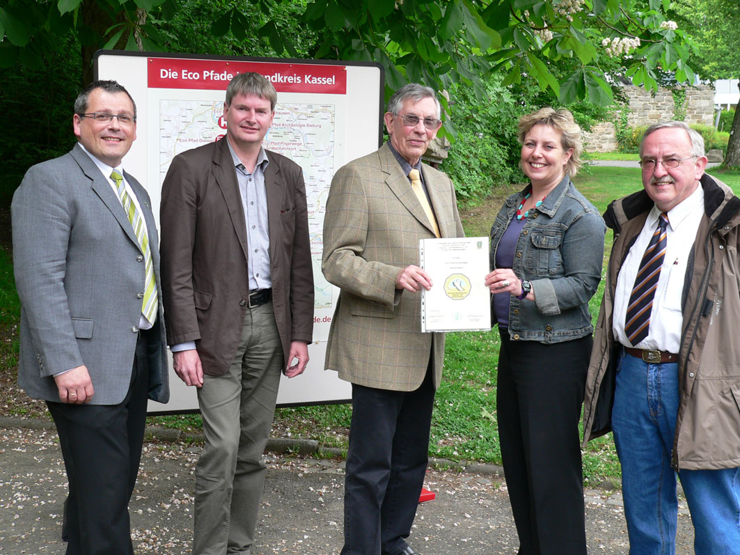 Auf dem Foto freuen sich von links nach rechts der Niestetaler Bürgermeister Andreas Siebert, Peter Nissen (Amt für den ländlichen Raum Hofgeismar), Roland Petrowsky (Vorsitzender des Hessisch-Waldeckischen Gebirgs- und Heimatvereins), Susanne Selbert (Betriebsleiterin des Eigenbetriebs Jugend- und Freizeiteinrichtungen des Landkreises Kassel) und der Niester Bürgermeister Edgar Paul.
