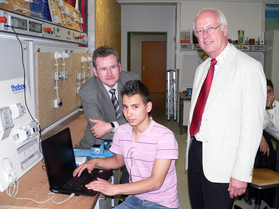 Auf dem Foto sieht man von links nach rechts Vizelandrat Uwe Schmidt, Serkan Calkin (Schüler der Willy-Brandt-Schule) und Schulleiter Reiner Heine