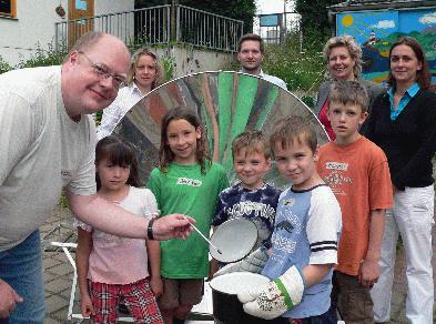 Auf dem Foto freuen sich von links nach rechts Klaus Memmen vom Wassererlebnishaus Fuldatal, Tanja Müller (Klimaanpassungsbeauftragte Landkreis Waldeck-Frankenberg), Volker Schmidt (Klimaanpassungsbeauftragter Schwalm-Eder-Kreis/Landkreis Hersfeld-Rotenburg), Susanne Selbert (Landkreis Kassel) und Kristina Schneider (Klimanpassungsbeauftragte Landkreis Kassel). Im Vordergrund informieren sich Grundschulkinder über einen Solarofen.