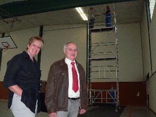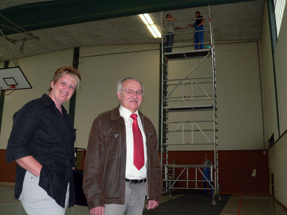 Auf dem Foto sieht man im Vordergrund Elke Hübel (Fachtechnikerin des Kreisfachbereichs Schulen und Bauwesen) und Otto Dörigmann (Leiter Fachbereich Schulen und Bauwesen). Im Hintergrund bereiten Mitarbeiter der Fa. Scholl das Anbringen der Deckenstrahlplatten vor.