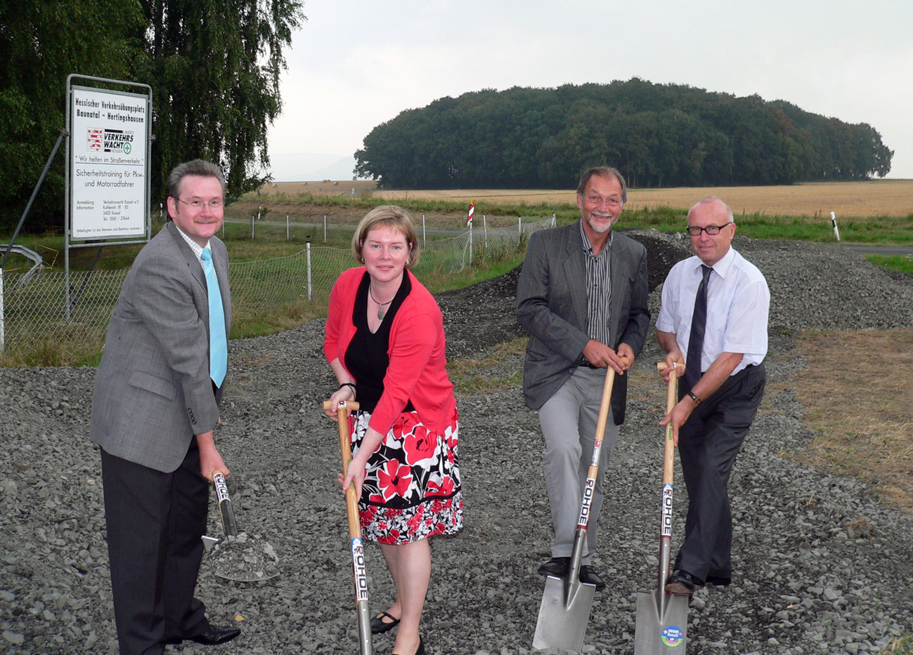 Auf dem Foto sieht man von links nach rechts Landrat Uwe Schmidt, Silke Engler-Kurz (1. Stadträtin Baunatal), Werner Gautsch (Leiter des Amtes für Straßen- und Verkehrswesen Kassel) und Dieter Loewen (Technischer Leiter Fa. Rohde, Korbach) mit den Spaten im Schotter.