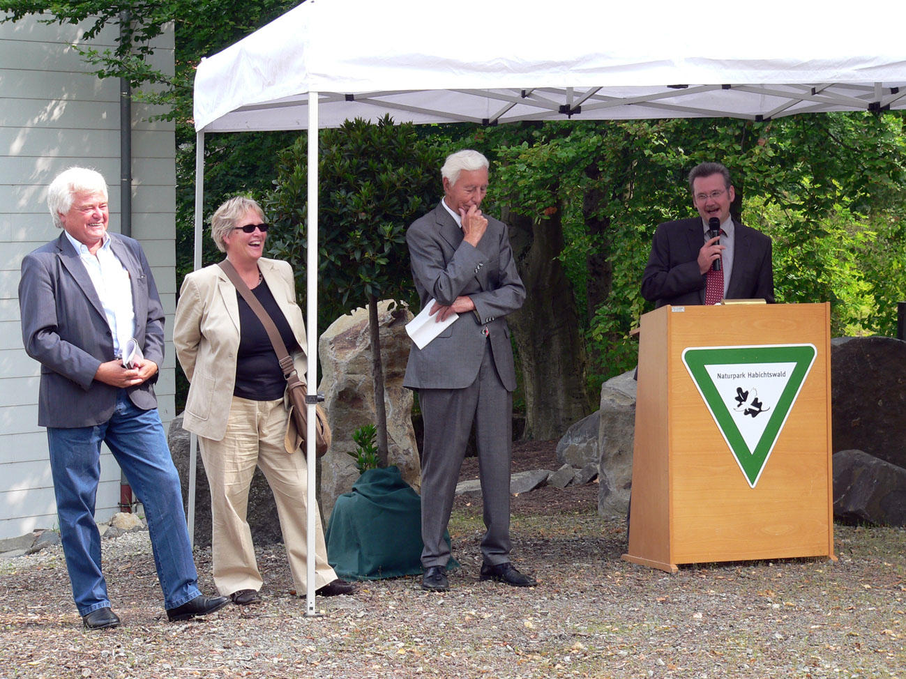 Auf Bild 2 freuen sich von links nach rechts Landrat a.D. Dr. Udo Schlitzberger, Regula Ohlmeier (Leiterin des Garten- und Umweltamtes der Stadt Kassel), Staatsminister a.D. Dr. Herbert Günther (Ehrenpräsident der Deutschen Naturparke) und Landrat Uwe Schmidt (zugleich Vorsitzender des Zweckverbandes Naturpark Habichtswald).