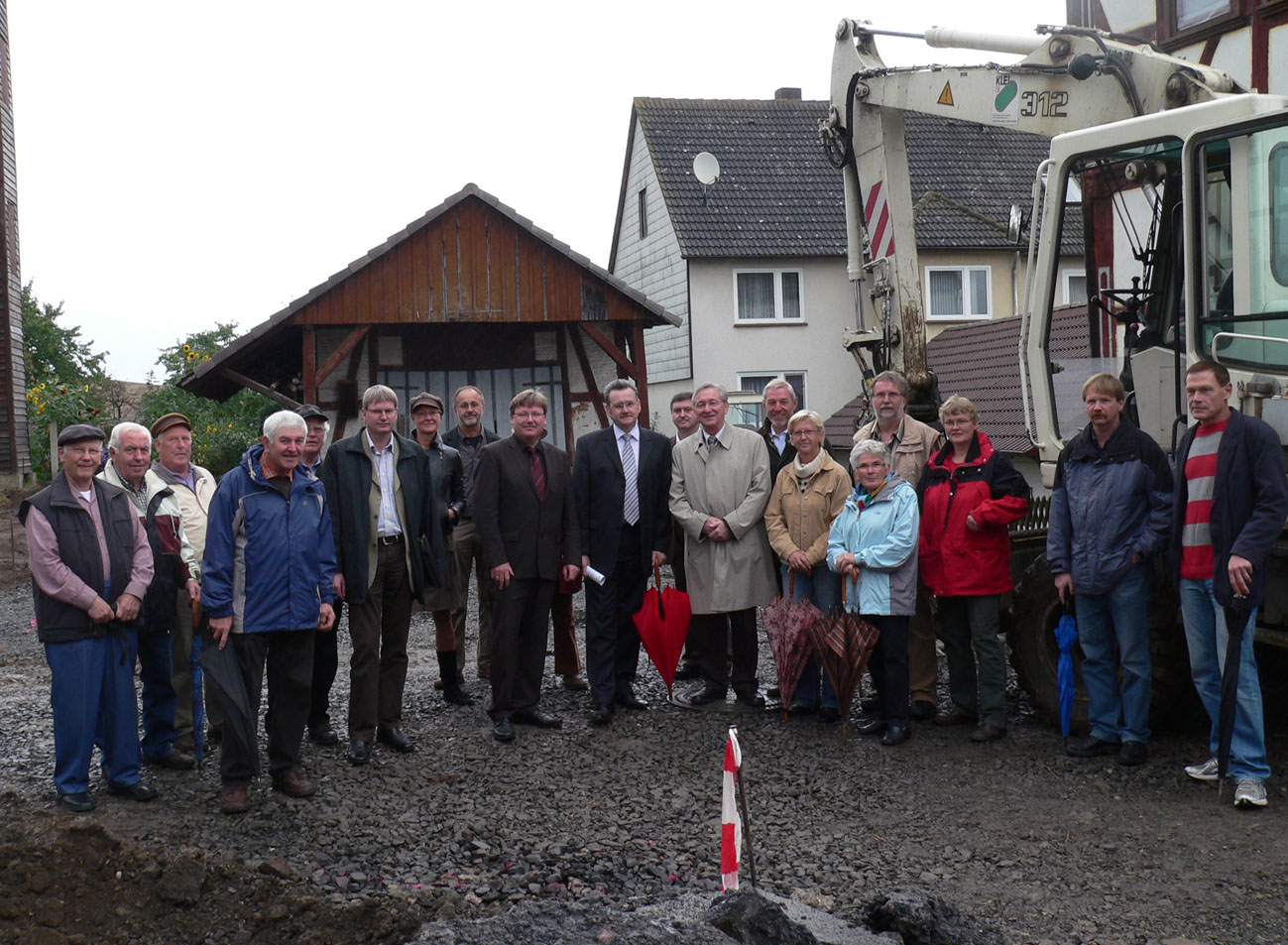 Auf dem Foto freut sich die Dorfgemeinschaft über die bereits begonnenen Umbaumaßnahmen - in der Mitte Bürgermeister Ralf Pfeiffer und Landrat Uwe Schmidt (mit rotem Schirm).
