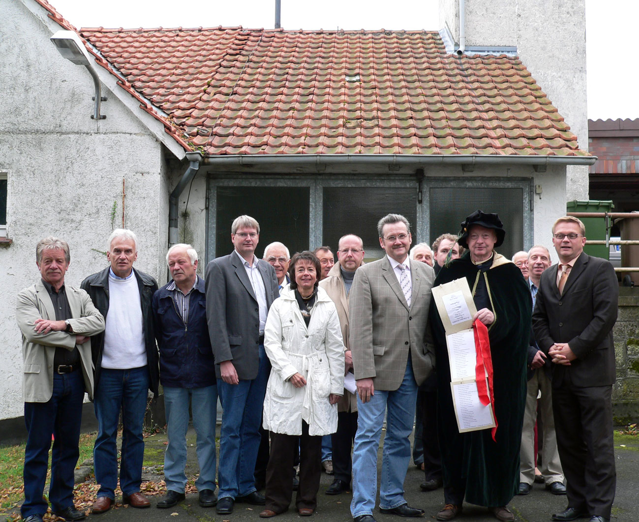 Auf dem Foto freut sich der Arbeitskreis Dorferneuerung mit Landrat Uwe Schmidt und Bürgermeister Stefan Denn über die Fördersumme.