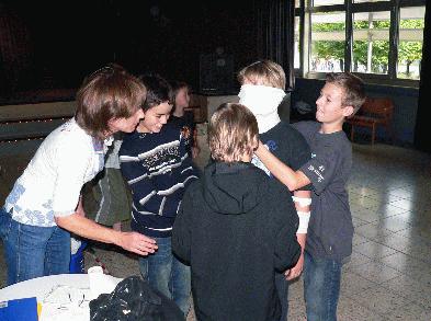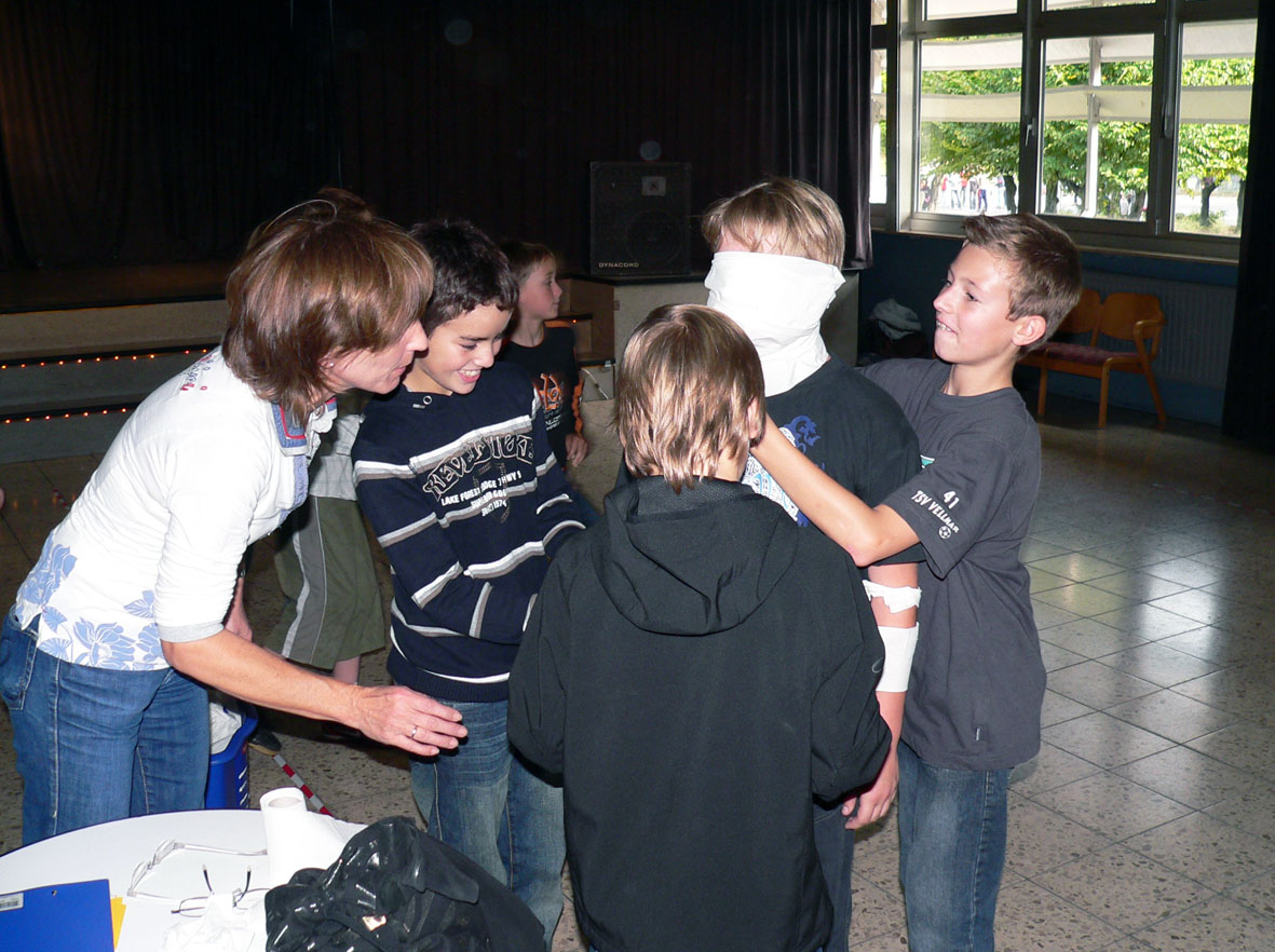 Auf den Fotos sieht man ein Team beim "Mumienbauen" - links gibt Liane Schulz-Reichert von der Jugendförderung der Stadt Vellmar Hinweise. Außerdem werden neue Aufgaben ausgewürfelt und es gibt ein Porträtfoto von Michaela Blattert.