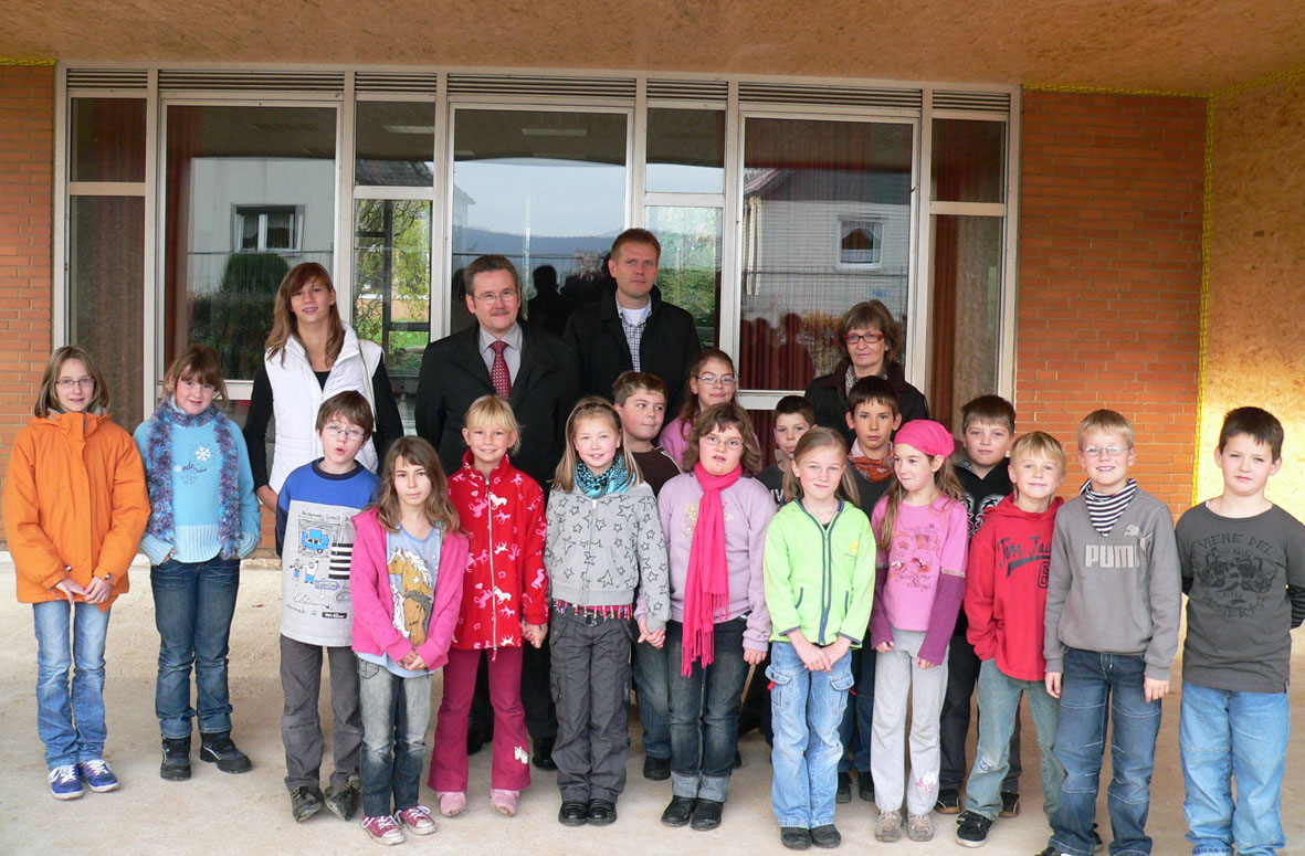 Auf dem Foto freuen sich die Schüler der Klasse 3 a zusammen mit Landrat Uwe Schmidt, Architekt Thomas Meyer und Schulleiterin Annerose Ziegler-Möller im noch nicht fertiggestellten Anbau des Multifunktionsraums. Der angehängte Plan zeigt, wie die Schule nach Fertigstellung aussieht.