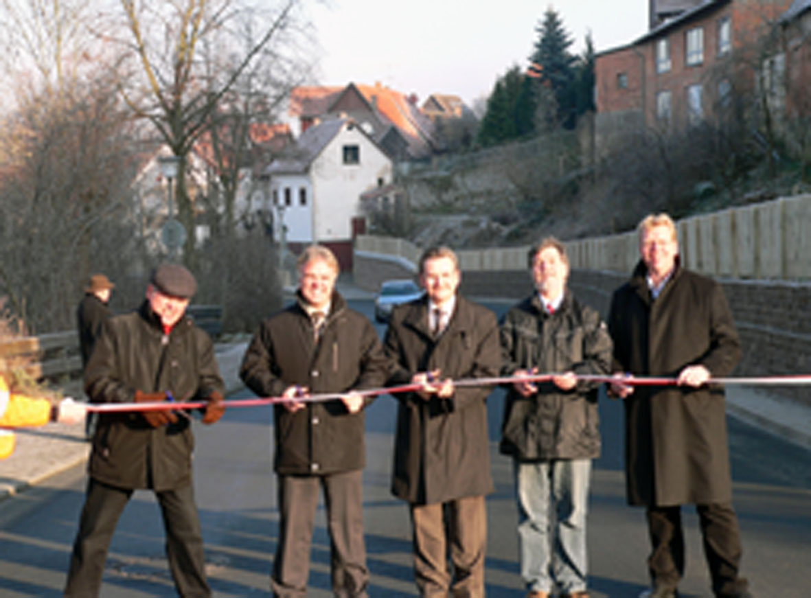 Auf dem Foto schneiden von links nach rechts Volker Schilling (Kreistagsmitglied aus Wolfhagen), Reinhard Schaake (Bürgermeister), Landrat Uwe Schmidt, Rüdiger Albrecht (ASV Kassel) und Klaus Gräbe (Firma Gra-Bak) das offizielle Flatterband durch.