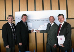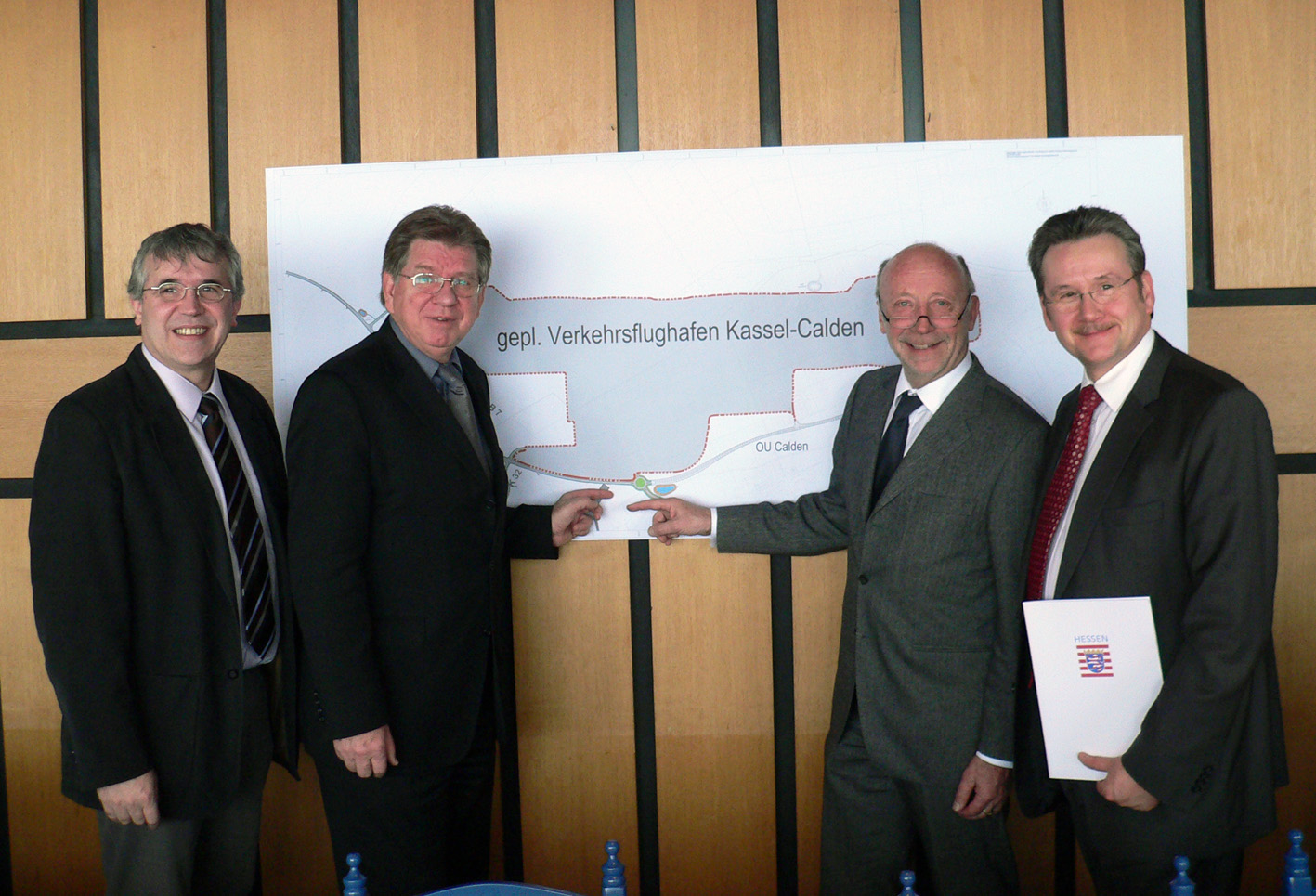 Auf dem Foto freuen sich von links nach rechts Andreas Dinges (Bürgermeister Calden), Jörg Ries (Geschäftsführer Flughafen GmbH), Staatsminister Dieter Posch und Landrat Uwe Schmidt.
