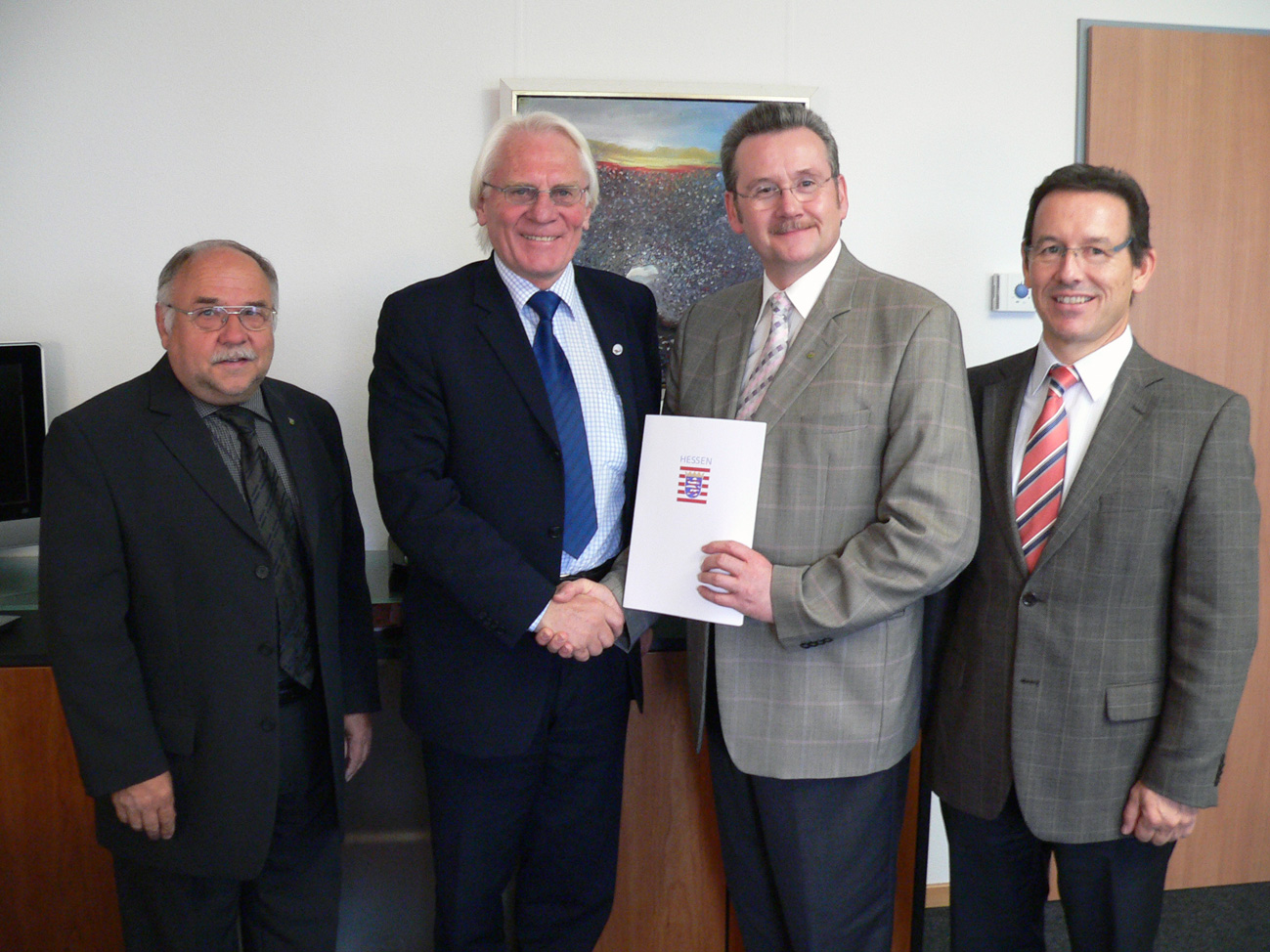 Das dritte Foto zeigt Karl Schäffer, Prof. Dr. Heinz Zielinski (Hessisches Innenministerium), Landrat Uwe Schmidt und Uwe Schenk bei der Entgegennahme des Förderbescheids für das Lehrschwimmbecken.