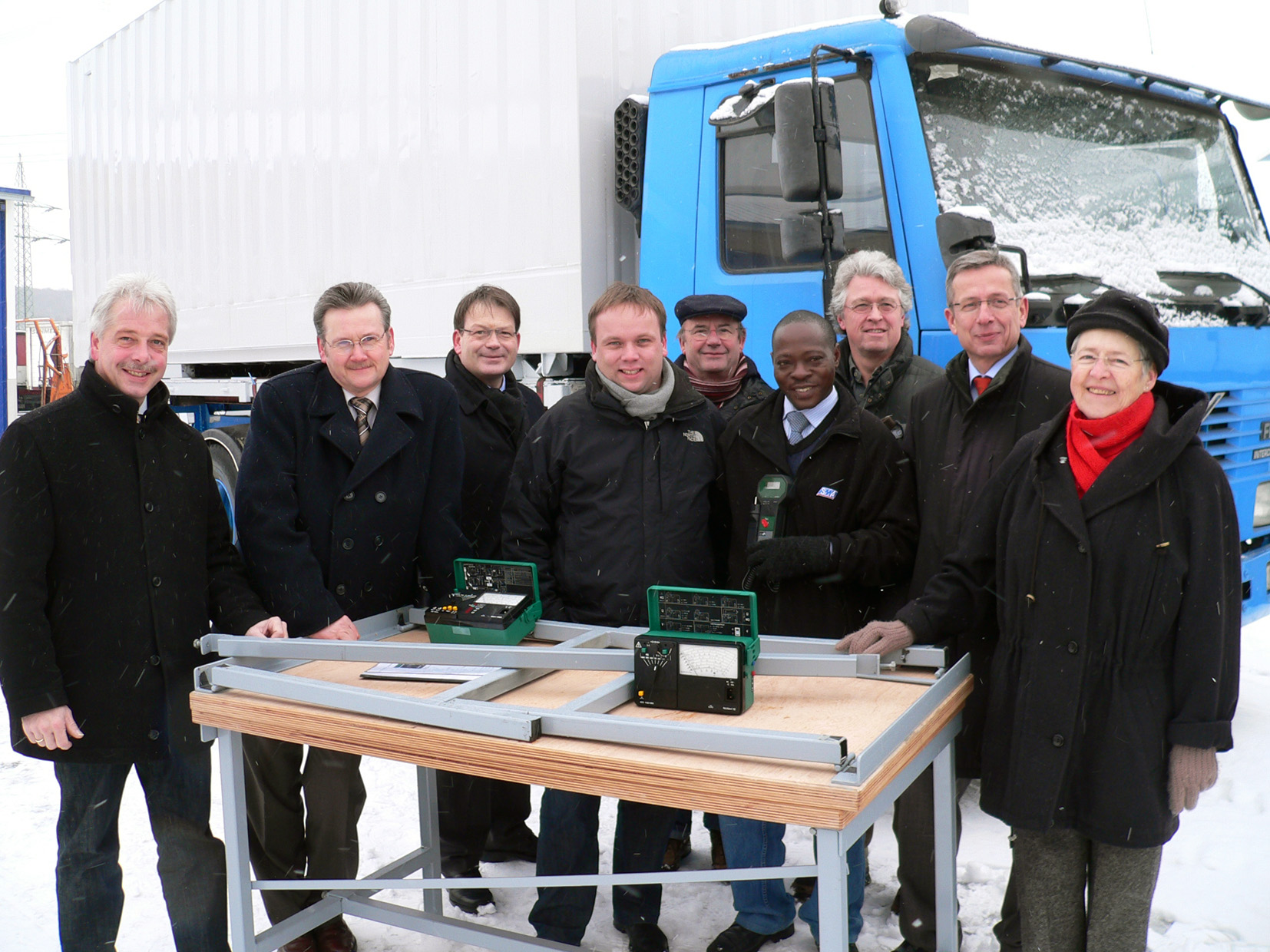 Auf dem Foto freuen sich von links nach rechts der Kaufunger Bürgermeister Peter Klein, Landrat Uwe Schmidt, GHT-Niederlassungsleiter Jörg Schaal, Landtagsabgeordneter Timon Gremmels, Klaus Löffel (Verein TOGETHER), Peter Basigara Baraza (Elektrotechniker aus Uganda), Klaus Friedrich (Verein TOGETHER), Herbert Baar (Geschäftsführer des Bildungszentrums Kassel GmbH) und Dagmar Zimbardo (Verein TOGETHER), dass ein neuer Transport für Uganda zustande gekommen ist.