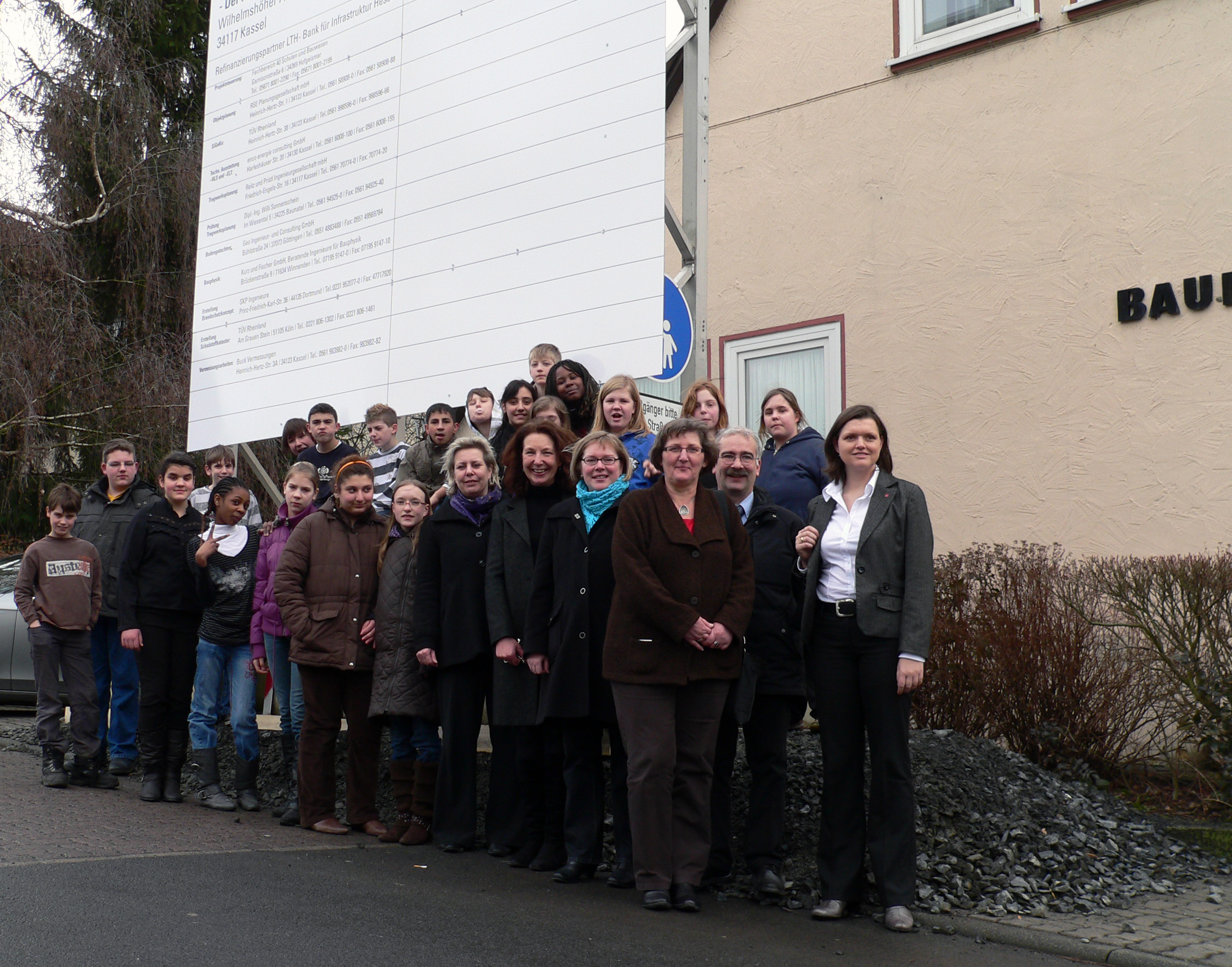 Auf dem Foto freut sich die Schulgemeinde inkl. Vizelandrätin und der Baunataler Ersten Beigeordneten Silke Engler-Kurz sowie der Architektin über den bevorstehenden Baubeginn.