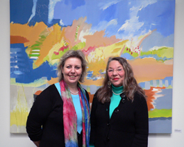 Auf dem Foto sieht man Bilder von Irmi Aumeier ("Im Fluss der Zeit" und "Im Fluss der Veränderung") sowie Vizelandrätin Susanne Selbert und Irmi Aumeier vor dem Bild "Im Fluss der Veränderung".