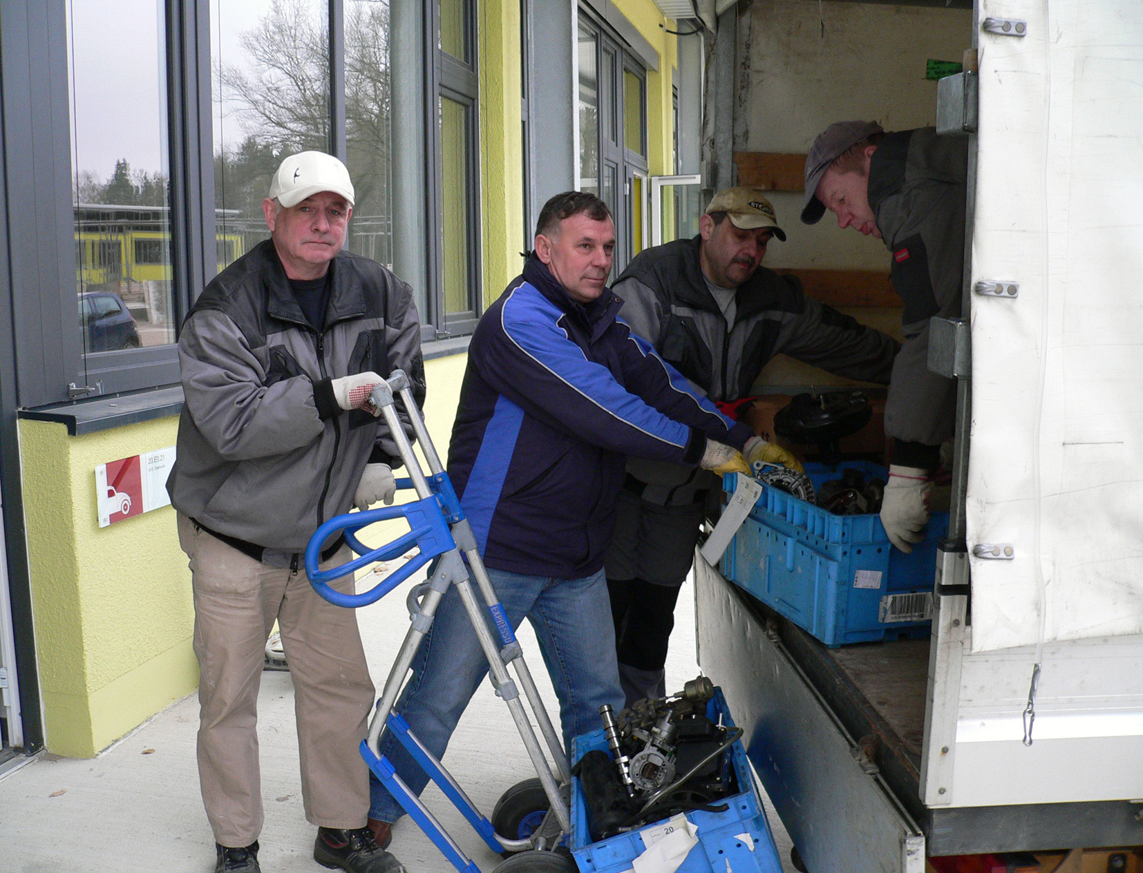 Auf dem Foto sieht man von links nach rechts Rainer Vollmer, Brahimi Ruten, Karl-Heinz Dingeler und Klaus-Jürgen Jacobs (alle AGiL) beim Ausladen der Unterrichtsmaterialien.