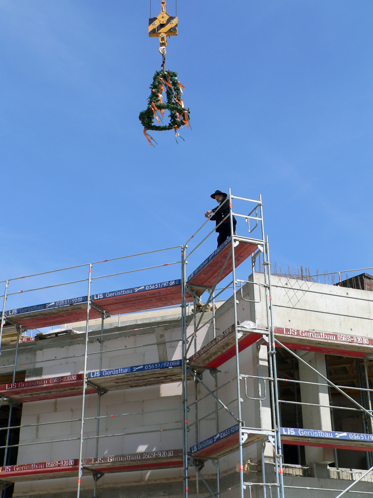 Auf den Fotos sieht man die Ausführung des Richtspruchs, die dem Richtspruch lauschenden zahlreichen Besucher und GHT-Niederlassungsleiter Jörg Schaal, Architekt Joachim Döring und Landrat Uwe Schmidt vor dem Schulneubau.