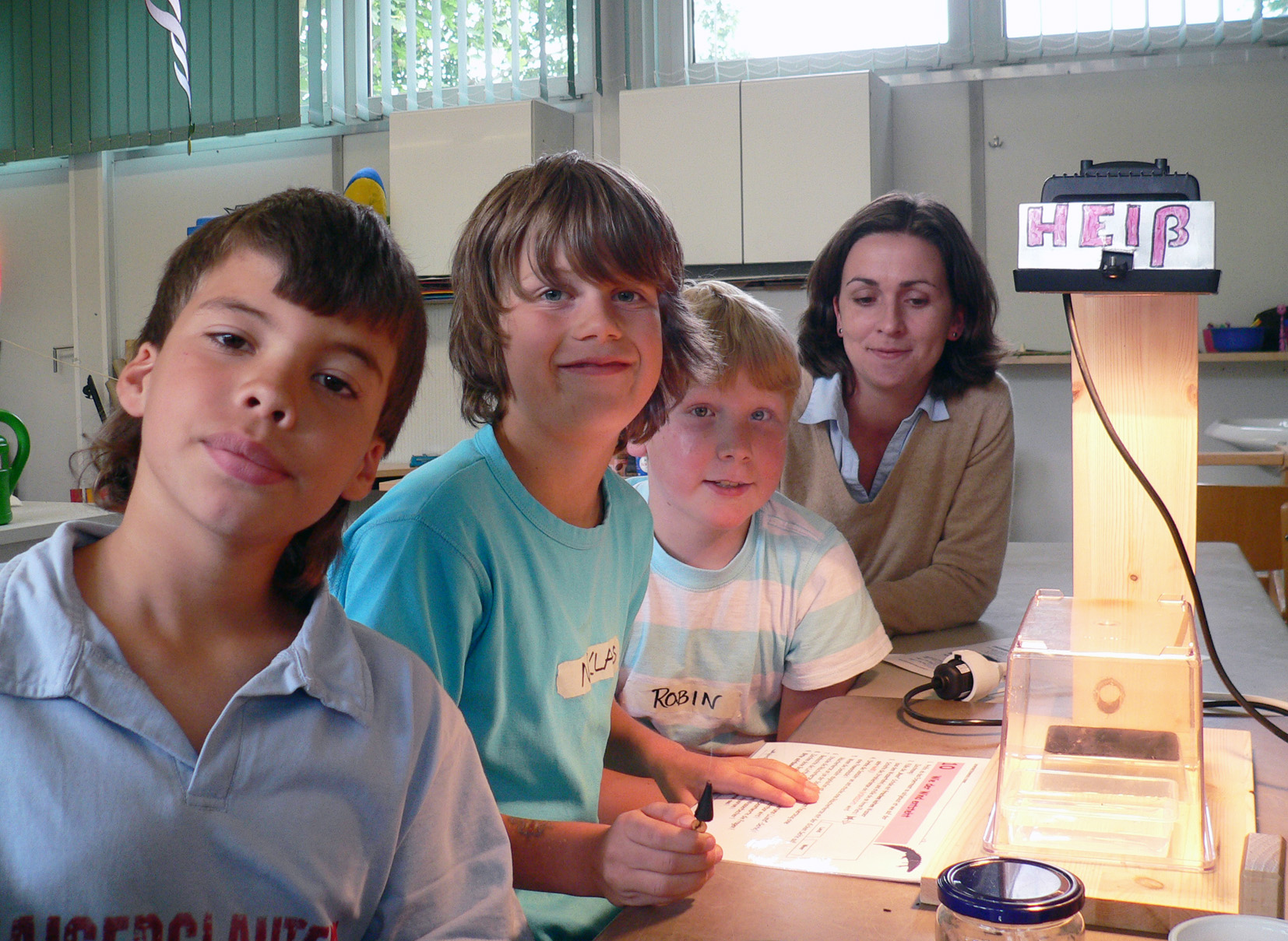 Auf dem Foto sieht man von links nach rechts Jasin, Niklas und Robin (Klasse 3a der Schule im Erlenhof) an einer der Projektstationen der Lernwerkstatt Klima, beobachtet von Klimaanpassungsbeauftragter Kristina Schneider.