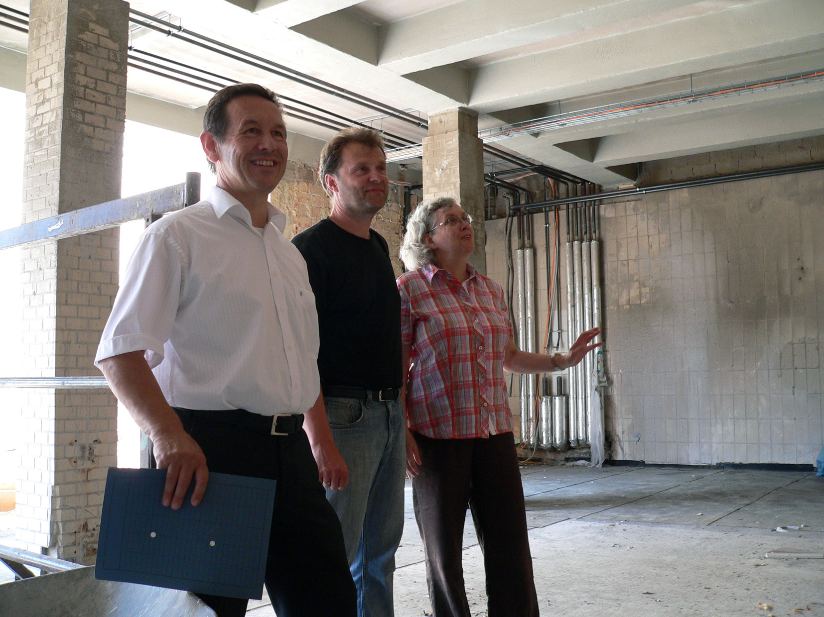 Auf dem Foto sieht man von links nach rechts Uwe Schenk (Landkreis Kassel), Gerhard Ackerbauer (Architektekturwerkstatt Ackerbauer + Warmuth) und Schulleiterin Roswitha Bohl-Bleil im ehemaligen Schwimmbecken und zukünftigen Lehrerzimmer der Förderschule. Das andere Foto zeigt die Bauarbeiten an der Grundschule.