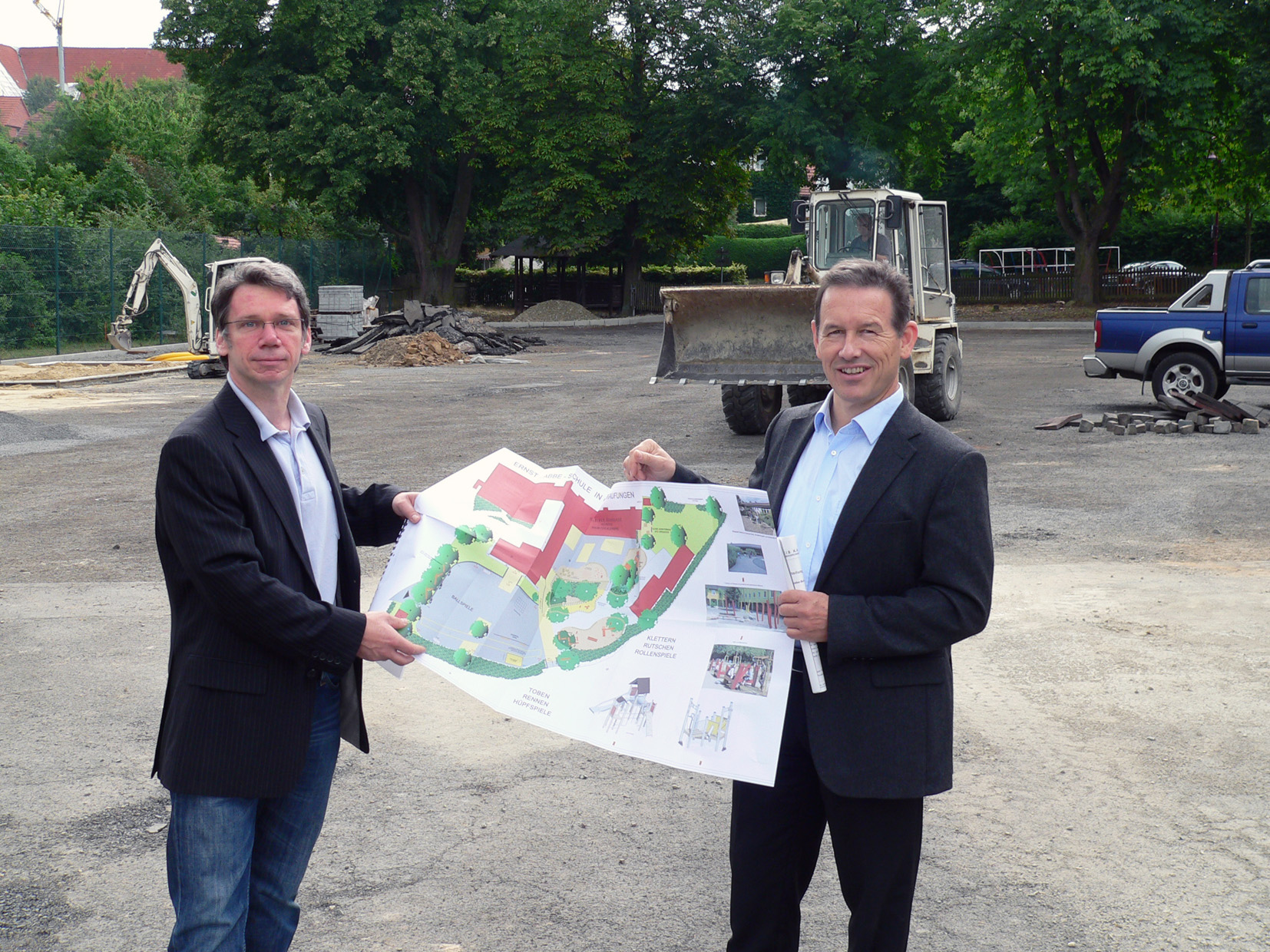 Auf dem Foto zeigen Dipl.-Ing. Matthias Wyss und Uwe Schenk vom Landkreis Kassel, wie der neue Pausenhof aussehen soll.