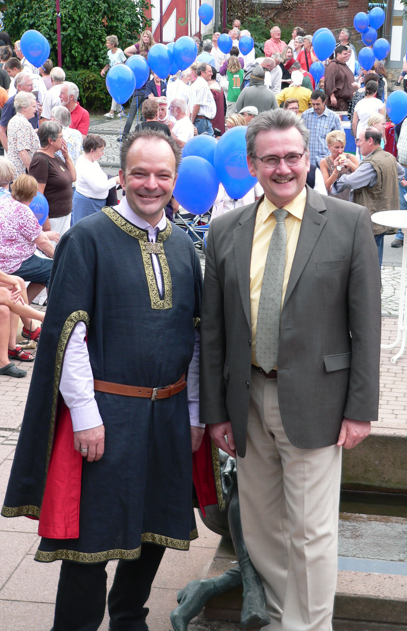 Auf dem Foto sieht man Bürgermeister Arnim Roß (im historischen Kostüm) und Landrat Uwe Schmidt, die sich auf die neue Bühne freuen. Im Hintergrund laufen die Feierlichkeiten zur 999-Jahr Feier Kaufungens.