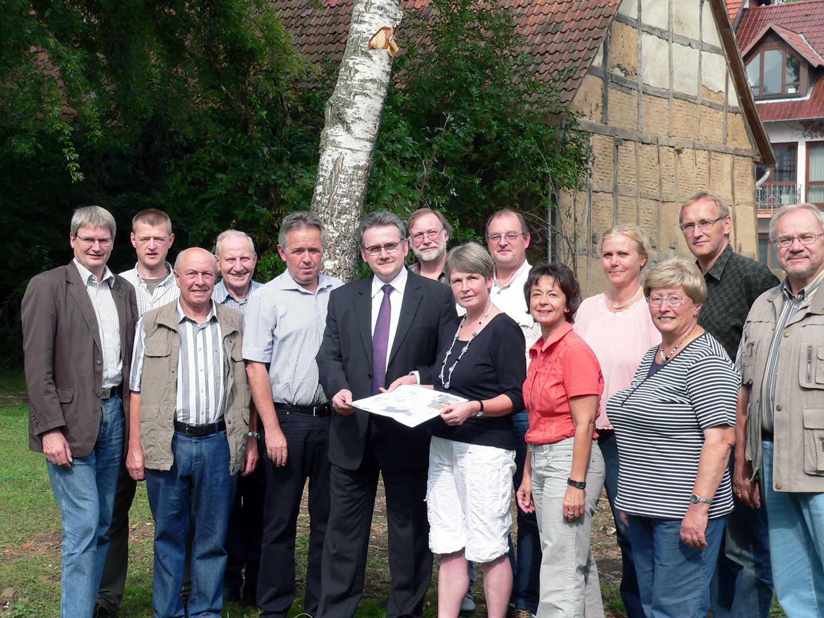 Auf dem Foto freuen sich Landrat, Bürgermeister, Landtagsabgeordnete und der Arbeitskreis Dorferneuerung über die Finanzierungszusage.
