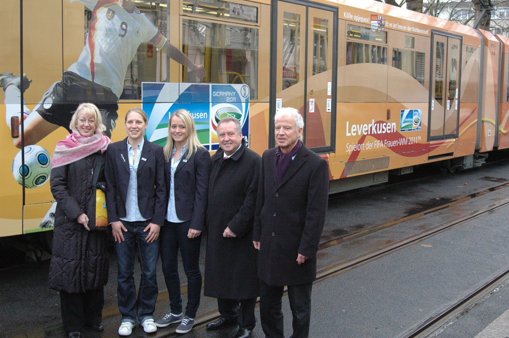 Den Start frei für die Linie 4 der KVB gaben (v.l.n.r.): Bürgermeisterin Elfi-Scho-Antwerpes, Bayer 04 Spielerinnen Maren Henseler und Lisa Schmitz, Oberbürgermeister Reinhard Buchhorn und der Leiter des WM-Büros, Hans Becker.