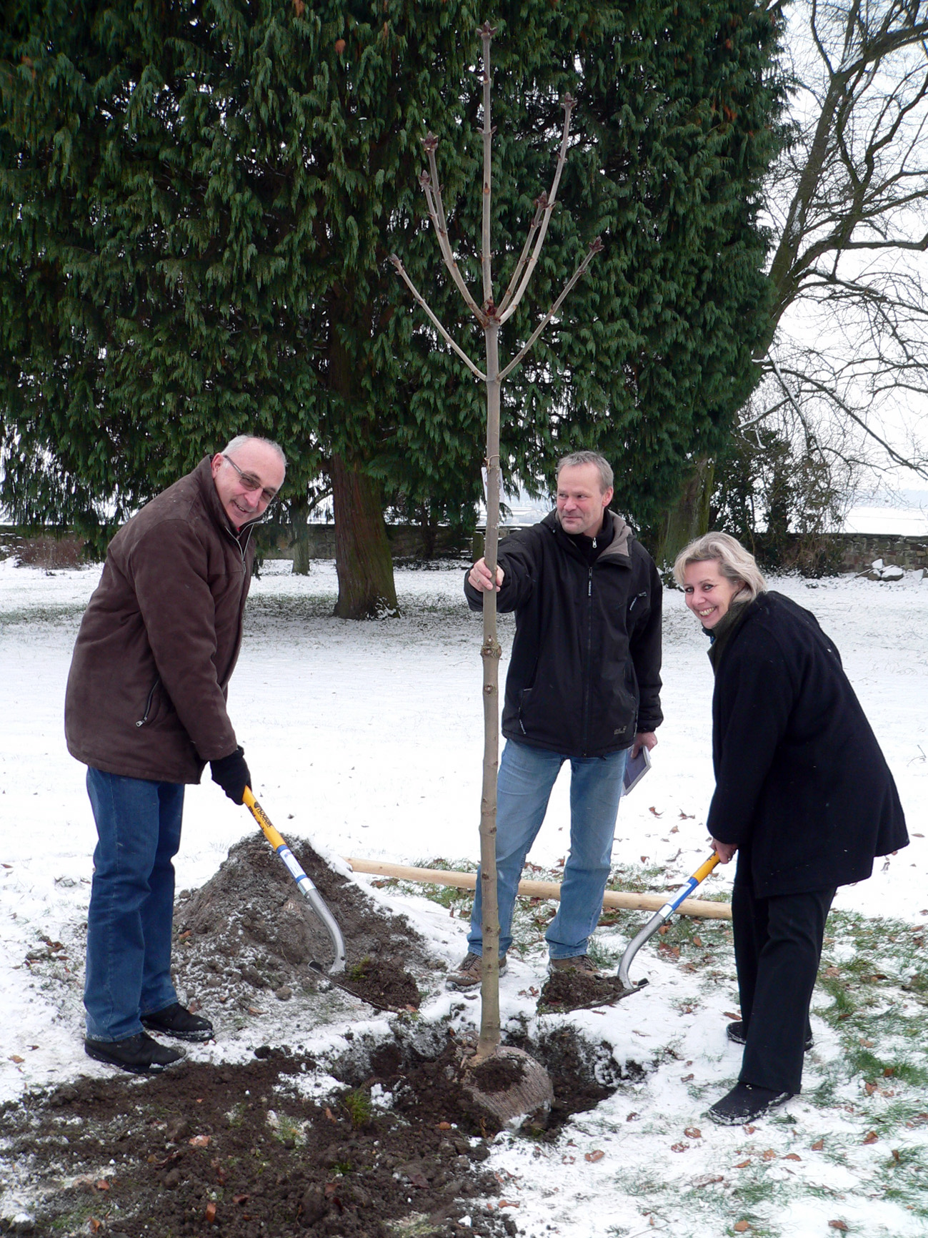 Auf dem Bild pflanzen Heinz Nehm (Leiter der Unteren Naturschutzbehörde des Landkreises Kassel) und Susanne Selbert (Vizelandrätin). Dr. Reiner Kunz (Mitarbeiter der Unteren Naturschutzbehörde) hält den "Jungen Riesen" fest.