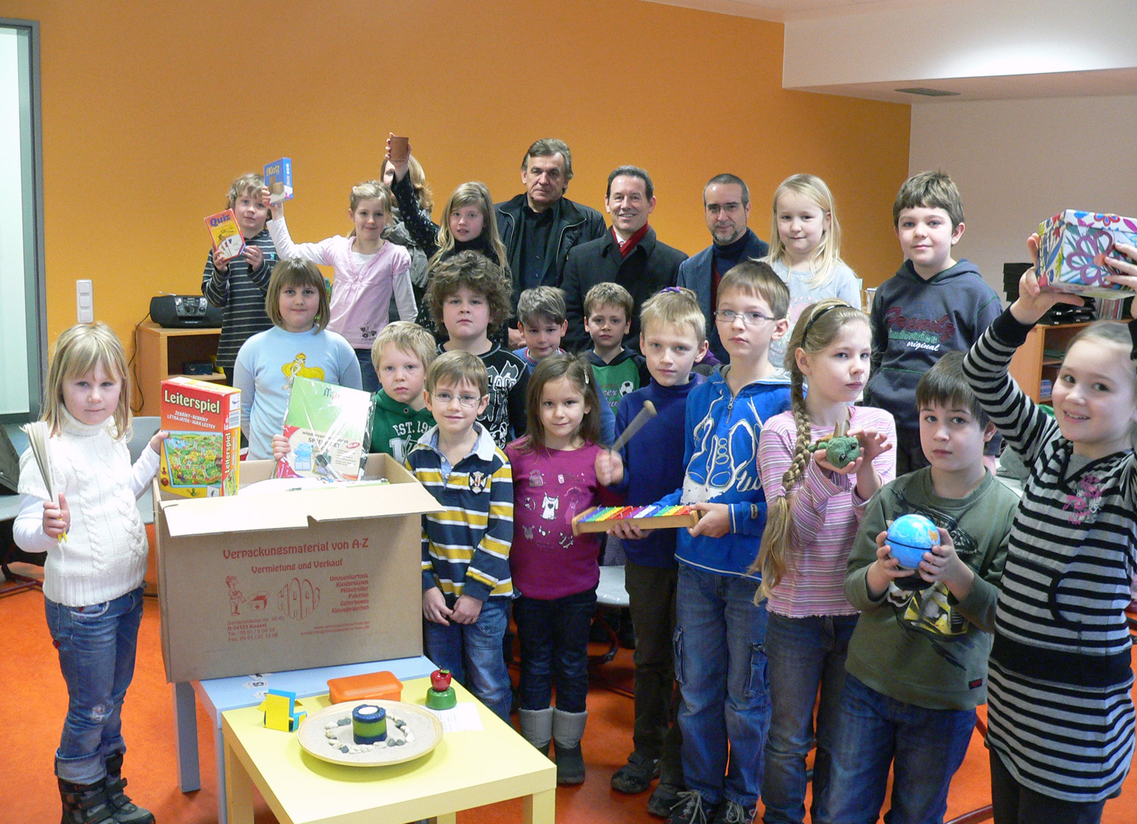 Auf den Fotos sieht man die neue Turnhalle und die Klasse 2a, die sich über die neuen Räume freut. Im Hintergrund sind von links nach rechts Klassenlehrerin Anne Dücker, Harald Pimper (ANP), Uwe Schenk und Schulleiter Dieter Kauffeld zu sehen.