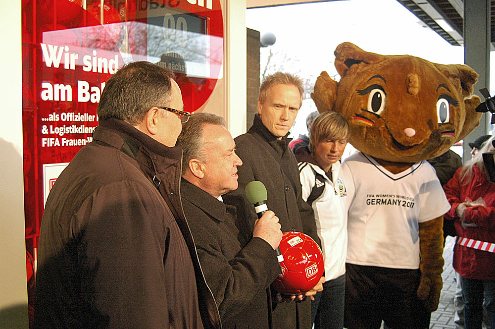 Vor der Countdown-Uhr (v.lks): Reiner Latsch, OB Reinhard Buchhorn, Carsten Ramelow, Sandra Minnert und WM-Maskottchen Karla Kick