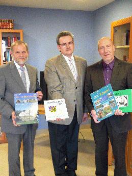 Auf dem Bild zeigen Klinikgeschäftsführer Wilfried Gründel, Landrat Uwe Schmidt und Klinikleiter Dr. Hans-Joachim Kronibus eine Auswahl der neuen Leseschätze.