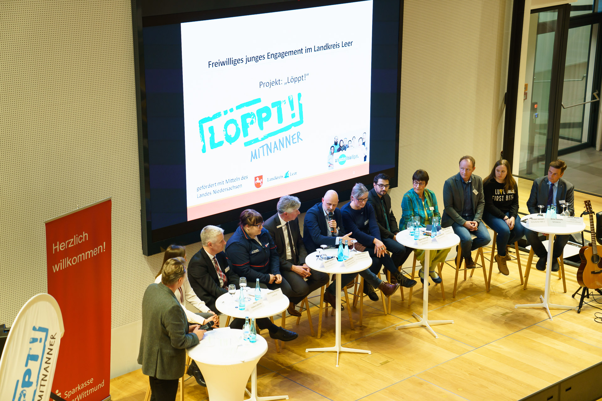 V.l.n.r. Gemeinsam mit Moderator Ludger Abeln tauschten sich Mara Többens-Dörries, Landrat Matthias Groote, Jasmin Sanders, Heinz Feldmann, Thorsten Thooren, Agnes Ratering, Omar Baktash, Sieglinde König, Torsten Janssen, Schülerin Anna Frerichs und Rainer Bruns über das "Junge Ehrenamt" aus.