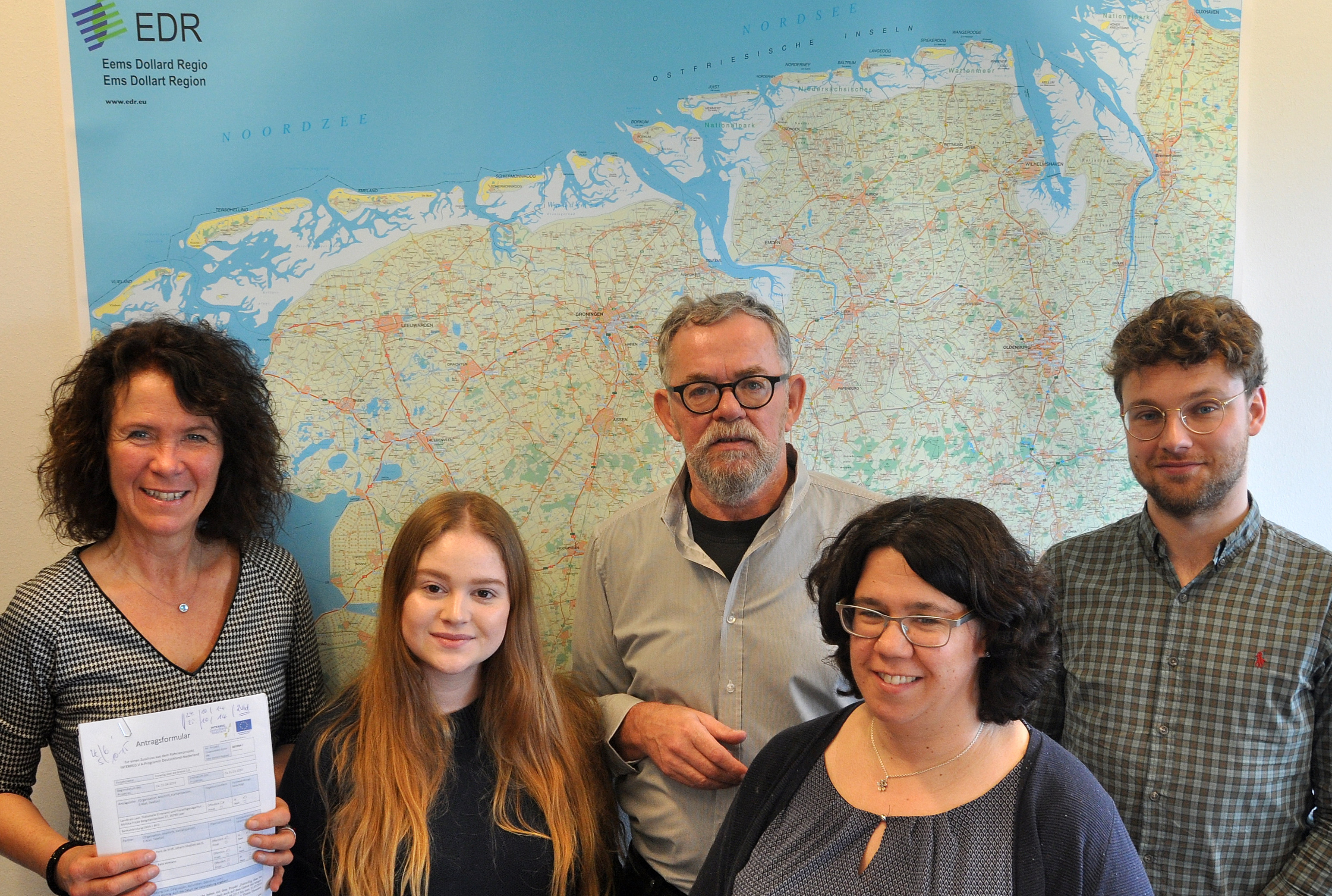 Sie haben ihre gute Zusammenarbeit fortgesetzt: Der Landkreises Leer und die Gemeente Oldambt haben im Jahr 2017 und 2018 mit dem Projekt „Freiwillig über die Grenze“ die Vielfalt des freiwilligen Engagements in zwei grenzübergreifenden Messen dargestellt. Das Bild zeigt Vertreter des Landkreises Leer, der Provincie Groningen, der Gemeente Oldambt und der Ems Dollart Region.