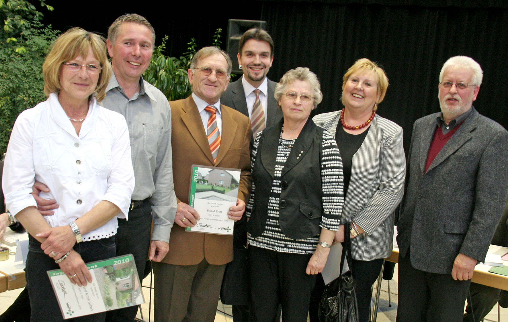 Bürgermeister Dr. Uli Paetzel und Stadtbildpfleger Egon Walberg (re.) kürten die Gewinner des Vorgartenwettbewerbs (v. li.): Den zweiten Platz belegten Angelika und Armin Gabert, den ersten Platz holte Ewald Ehm mit seiner Frau Edith und der dritte Platz ging an Longine Tiemann.