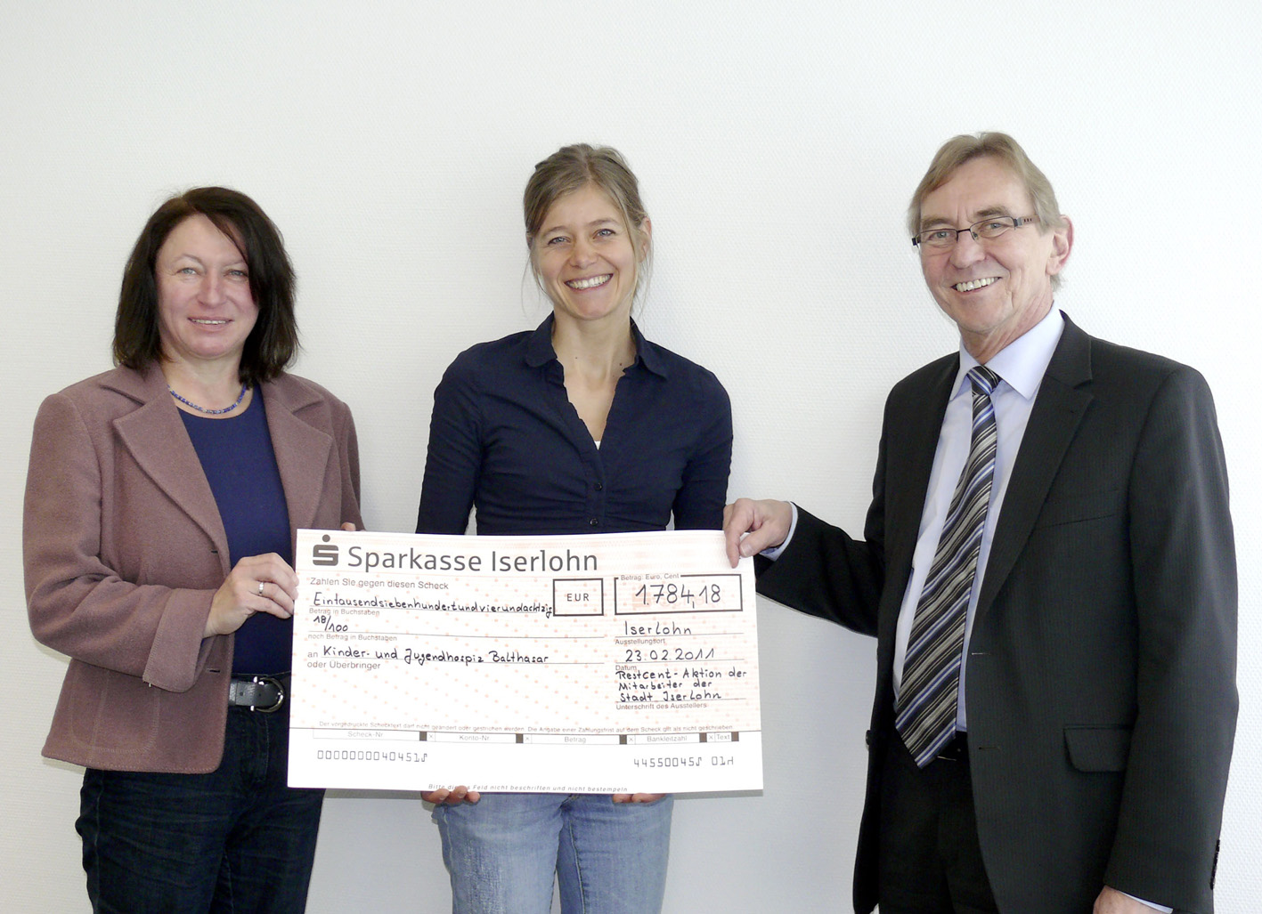 Bei einem Pressetermin im Iserlohner Rathaus übergaben Bürgermeister Dr. Peter Paul Ahrens und Karin Schleier vom Personalrat die Restcentspende der städtischen Mitarbeiter an die Referentin für Öffentlichkeitsarbeit des Kinder- und Jugendhospiz Balthasar Nicole Binnewitt (Mitte).