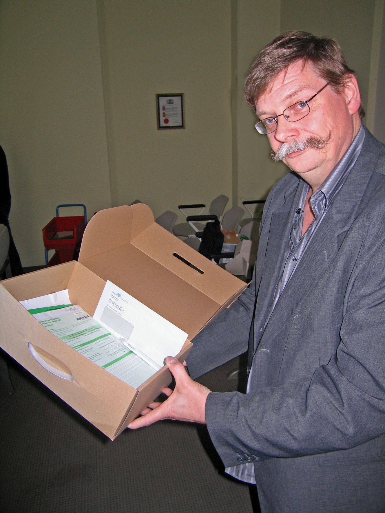 Norbert van de Rydt mit dem Material-Koffer, den alle Interviewer gut zwei Wochen vor dem Befragungsbeginn erhalten. Foto: Benedikt Giesbers / Kreis Viersen -Abdruck honorarfrei