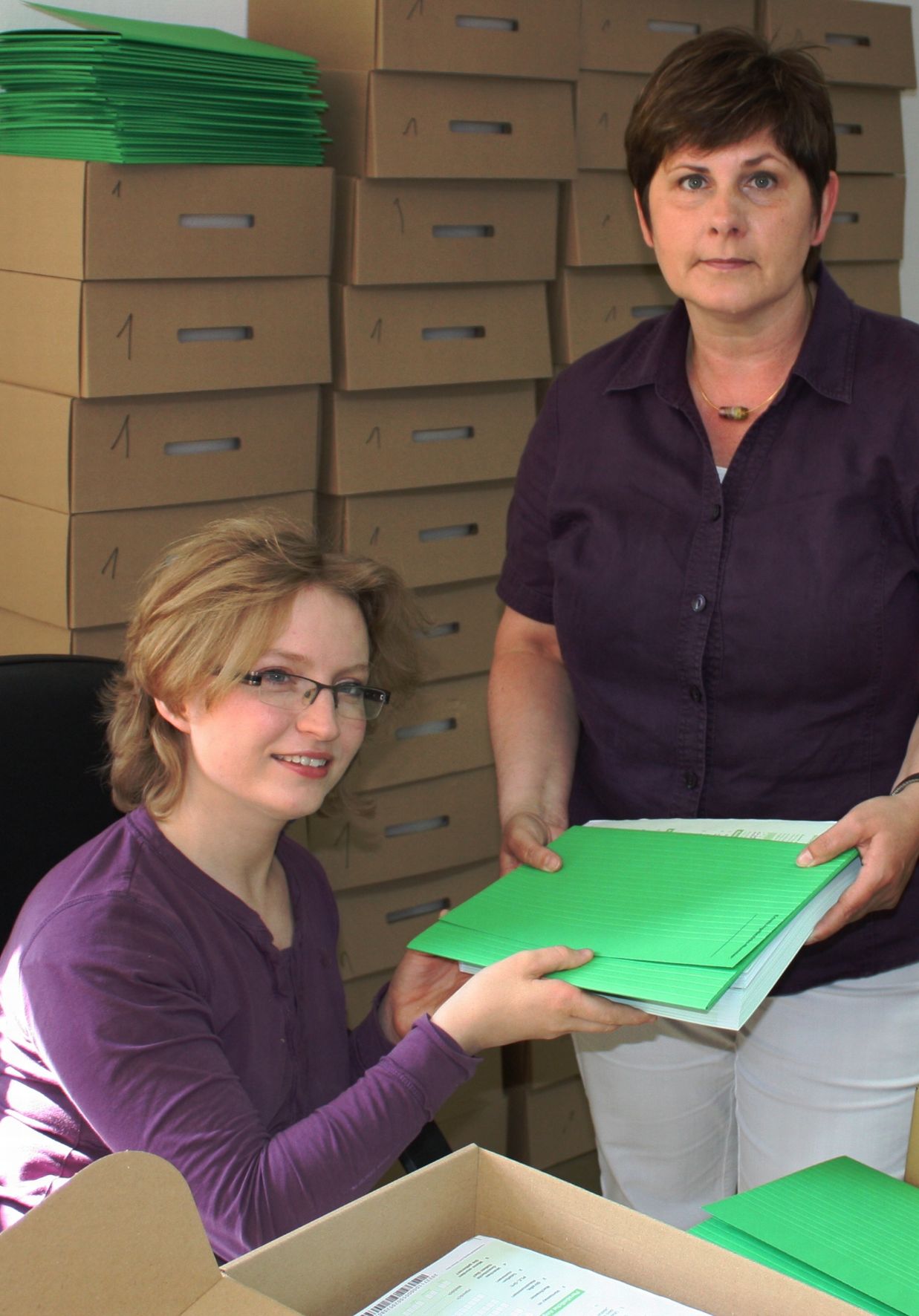 Tatjana Weber (links) und Doris Lankes bestücken die Interviewer-Koffer mit den Zensus-Fragebögen, Adressenlisten und Informationsflyern. Foto: Benedikt Giesbers / Abdruck honorarfrei