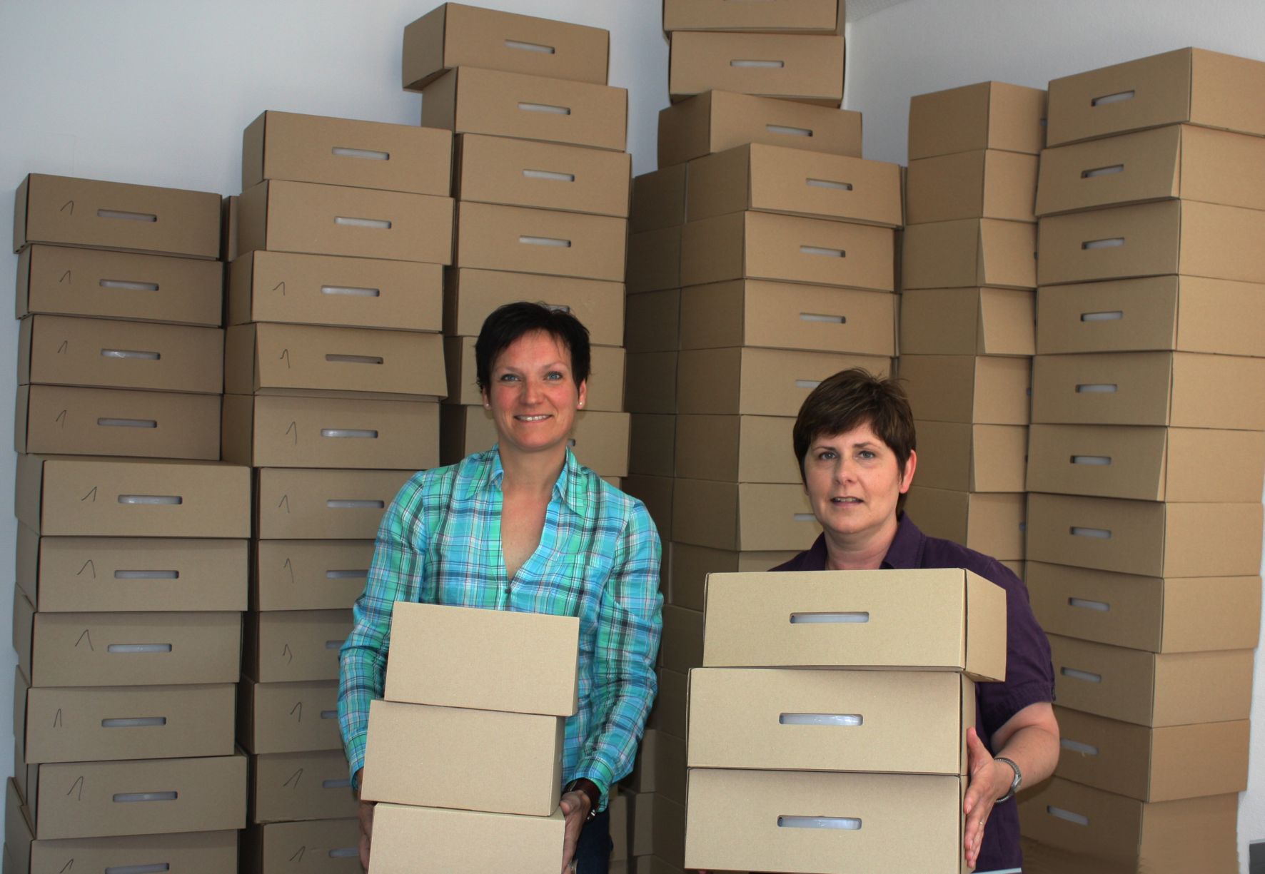 Michaela Wankum (links) und Doris Lankes vor den gestapelten Pappkoffern für die Interviewer. Foto: Benedikt Giesbers / Abdruck honorarfrei
